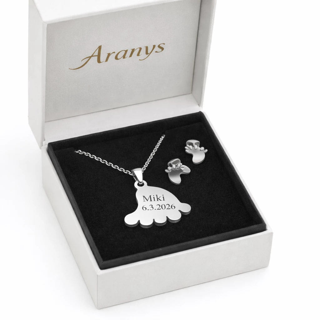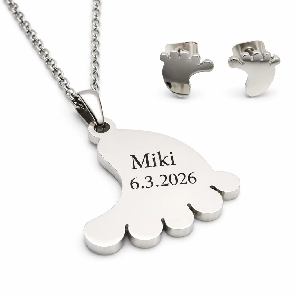 Ocelová souprava s nožičkou Amori je vyrobena z kvalitní chirurgické oceli a zaujme něžným motivem dětské nožičky. Souprava obsahuje náušnice a přívěsek s řetízkem, které společně vytvářejí jemný a symbolický šperk.