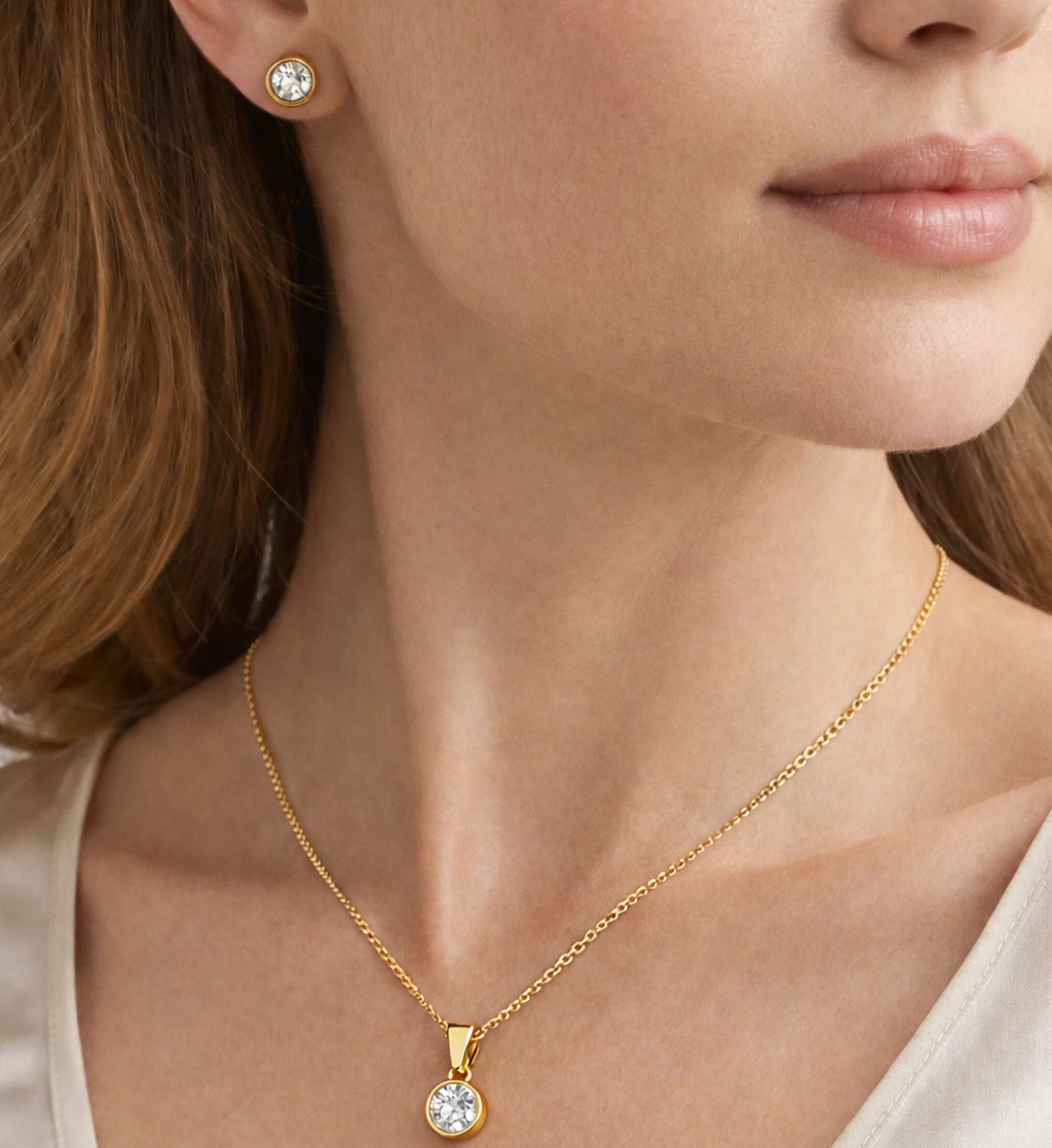 Ocelová zlacená souprava s krystalem Swarovski kruh Auriana představuje spojení minimalistického designu, jemného třpytu a nadčasové elegance. Dominantou šperku je precizně broušený krystal Swarovski zasazený do kulatého lůžka, které zvýrazňuje jeho čistotu a nádherný třpyt. Zlatý tón soupravy dodává šperku luxusní charakter a činí z něj univerzální doplněk pro každou příležitost.