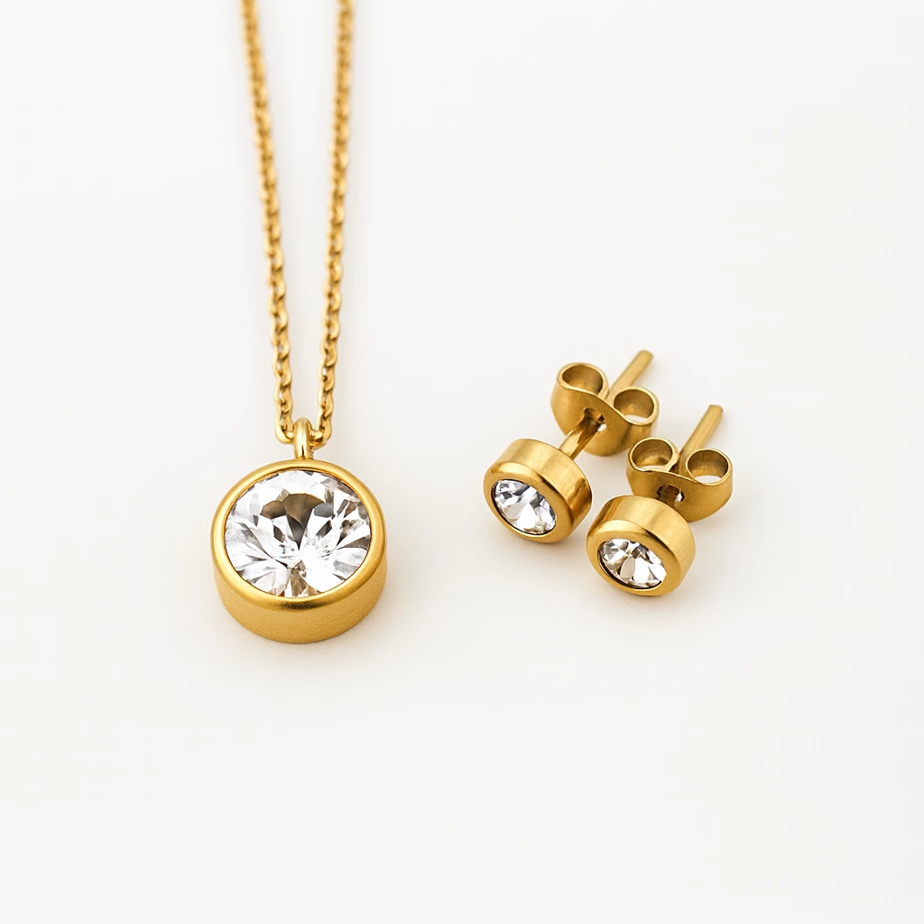 Zlacená dámská souprava z chirurgické oceli zdobená Swarovski krystaly je nepřehlédnutelným doplňkem pro každou příležitost.