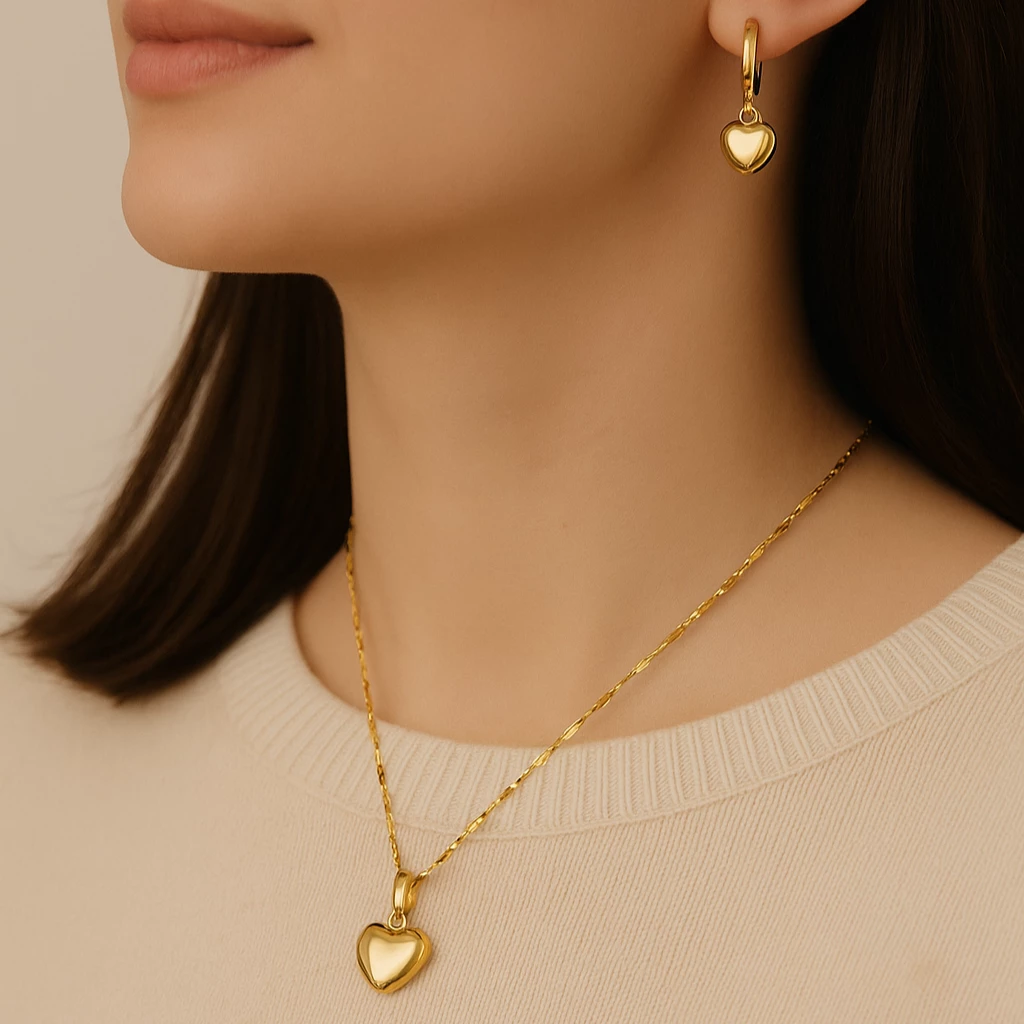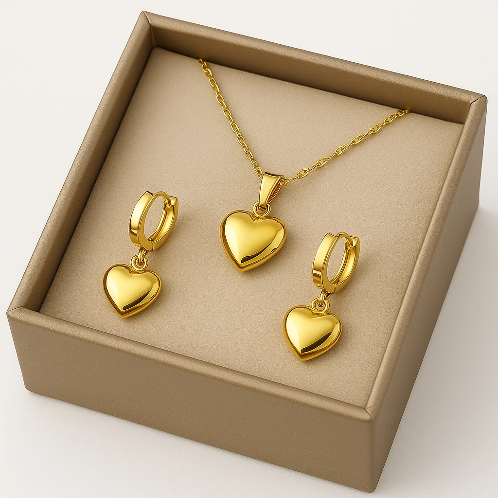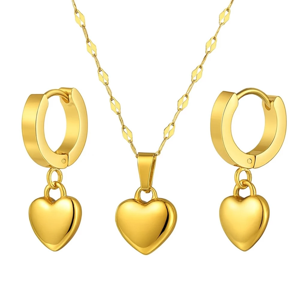 Elegantní a slušivá dámská zlacená souprava se srdíčky z chirurgické oceli je nepřehlédnutelným doplňkem pro každou příležitost. Souprava je tvořena z visacích náušnic se srdíčky a přívěsku na řetízku.