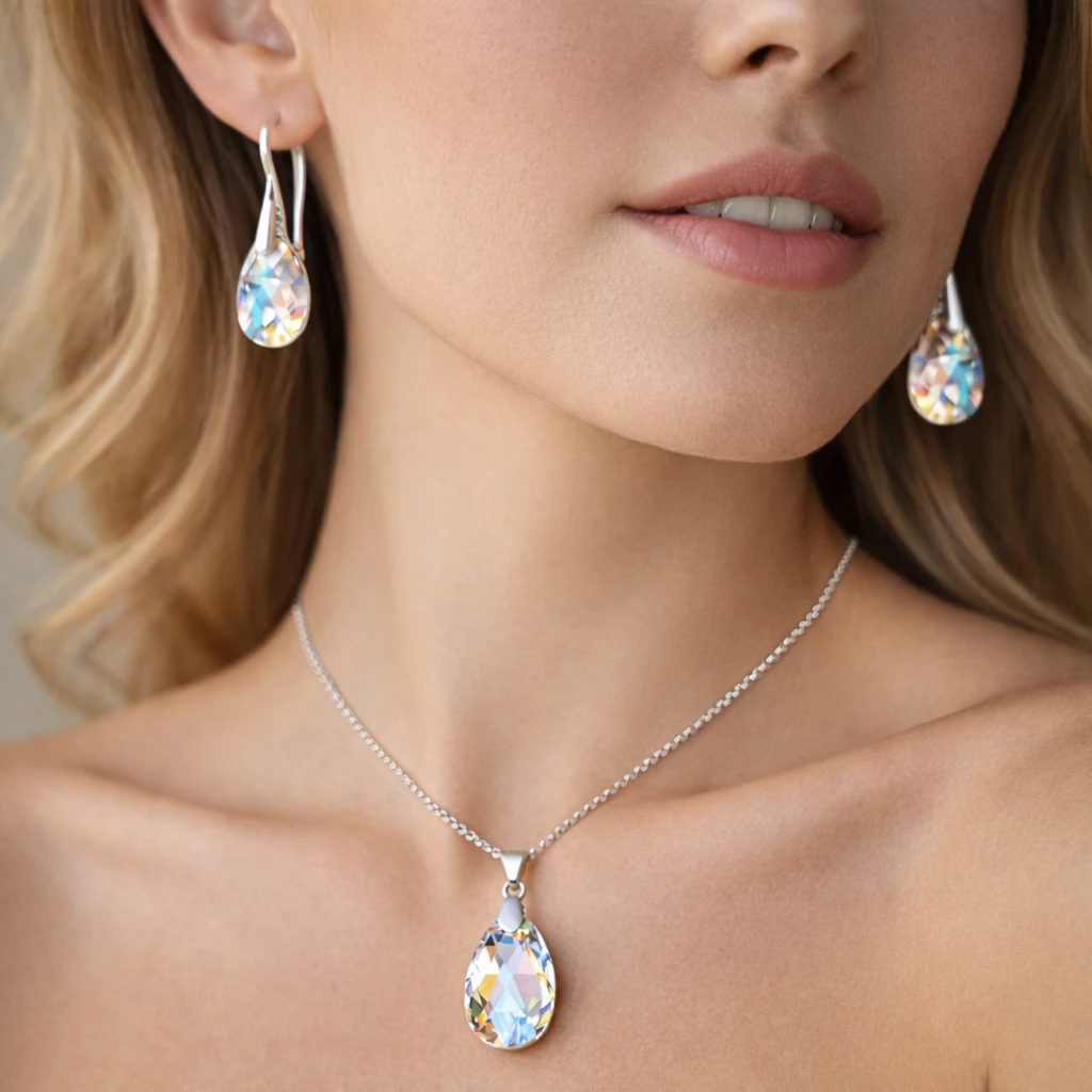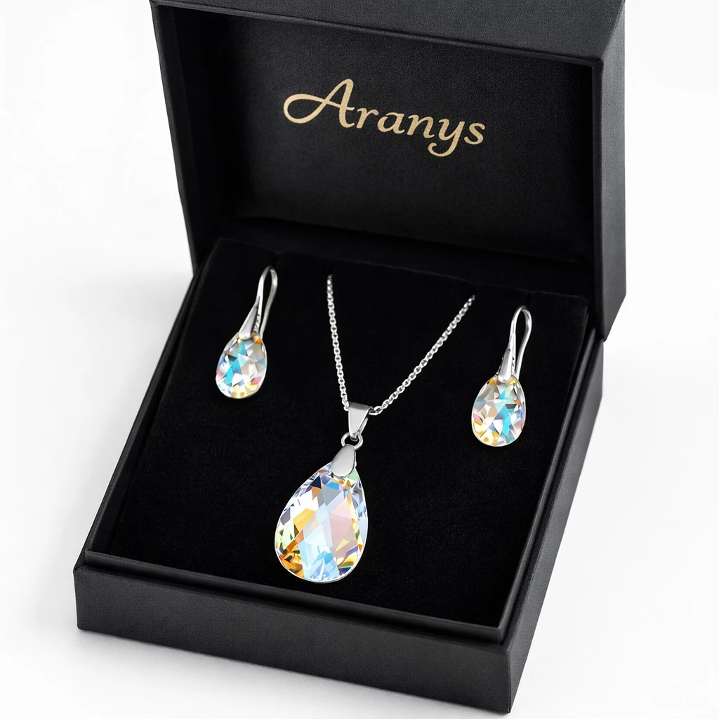 Elegantní ocelová souprava s originálními Swarovski krystaly ve tvaru kapky. Nadčasový design s intenzivním třpytem, který rozzáří každý outfit a podtrhne ženskou eleganci.