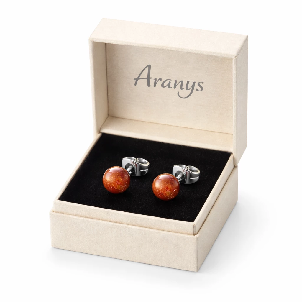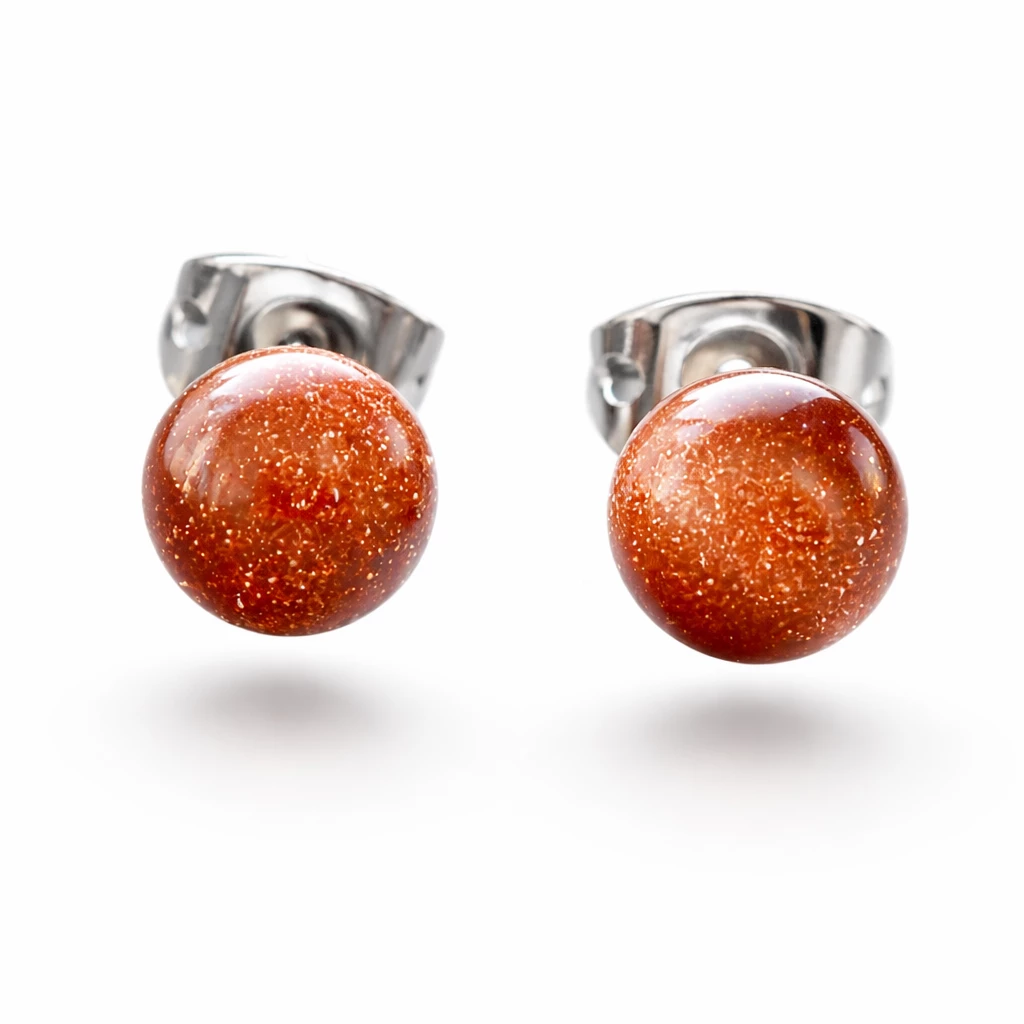 Jemné náušnice z chirurgické oceli s přírodním avanturínem, které zaujmou svým čistým tvarem a teplým zabarvením kamene.