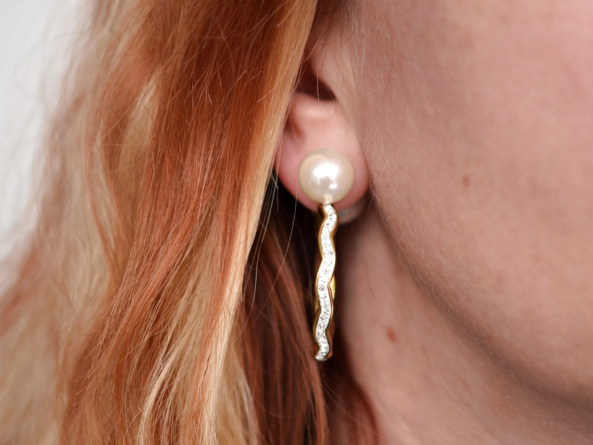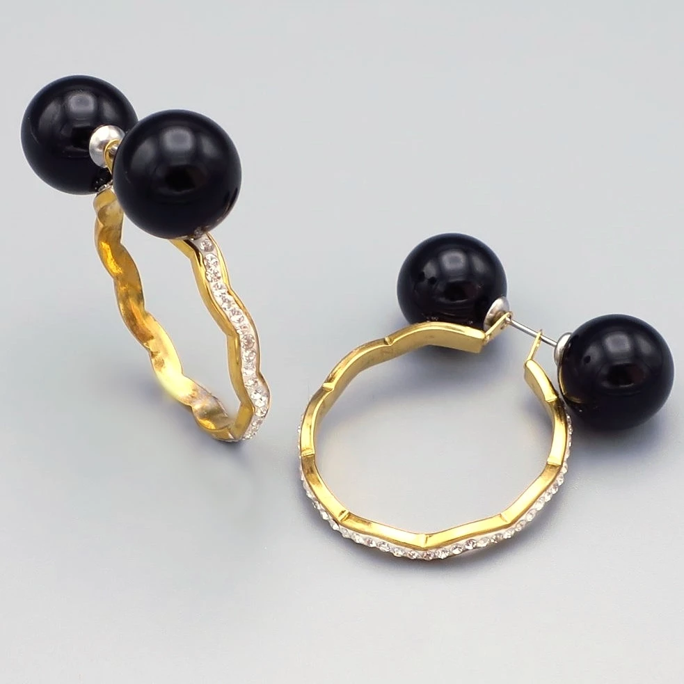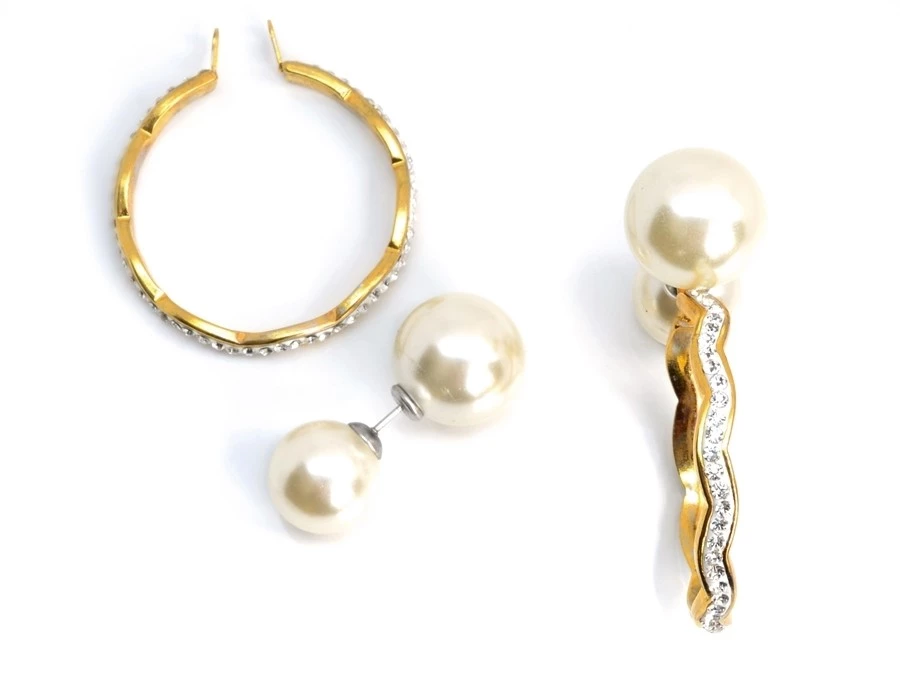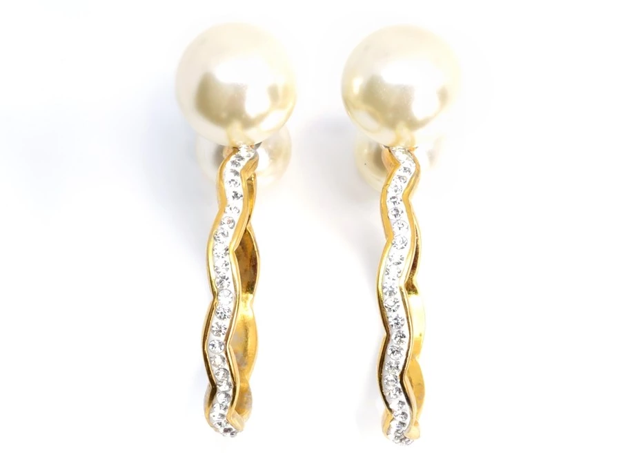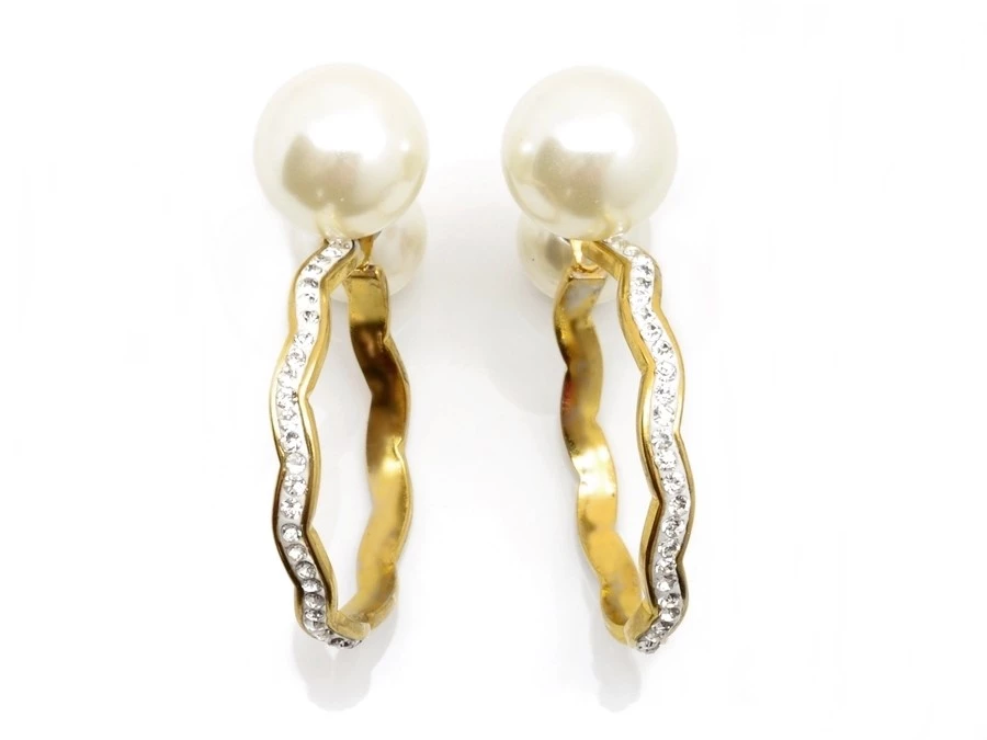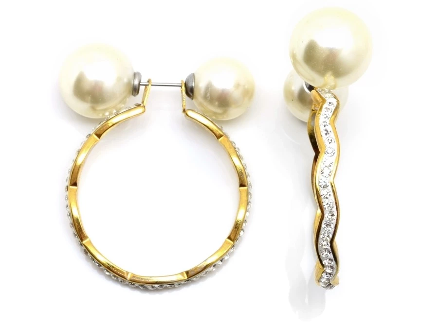 Stylové dámské náušnice 2 v 1. Navlékněte si je podle nálady nebo aktuálního outfitu. Náušnice jsou tvořené bílými oboustrannými kuličkami, které lze nosit samostatně. Pokud máte náladu na něco výraznějšího, jednoduše je doplňte o kruhovou část. Kruhy jsou ve zlaceném provedení, zdobené jemnými čirými zirkony na bílém podkladu.