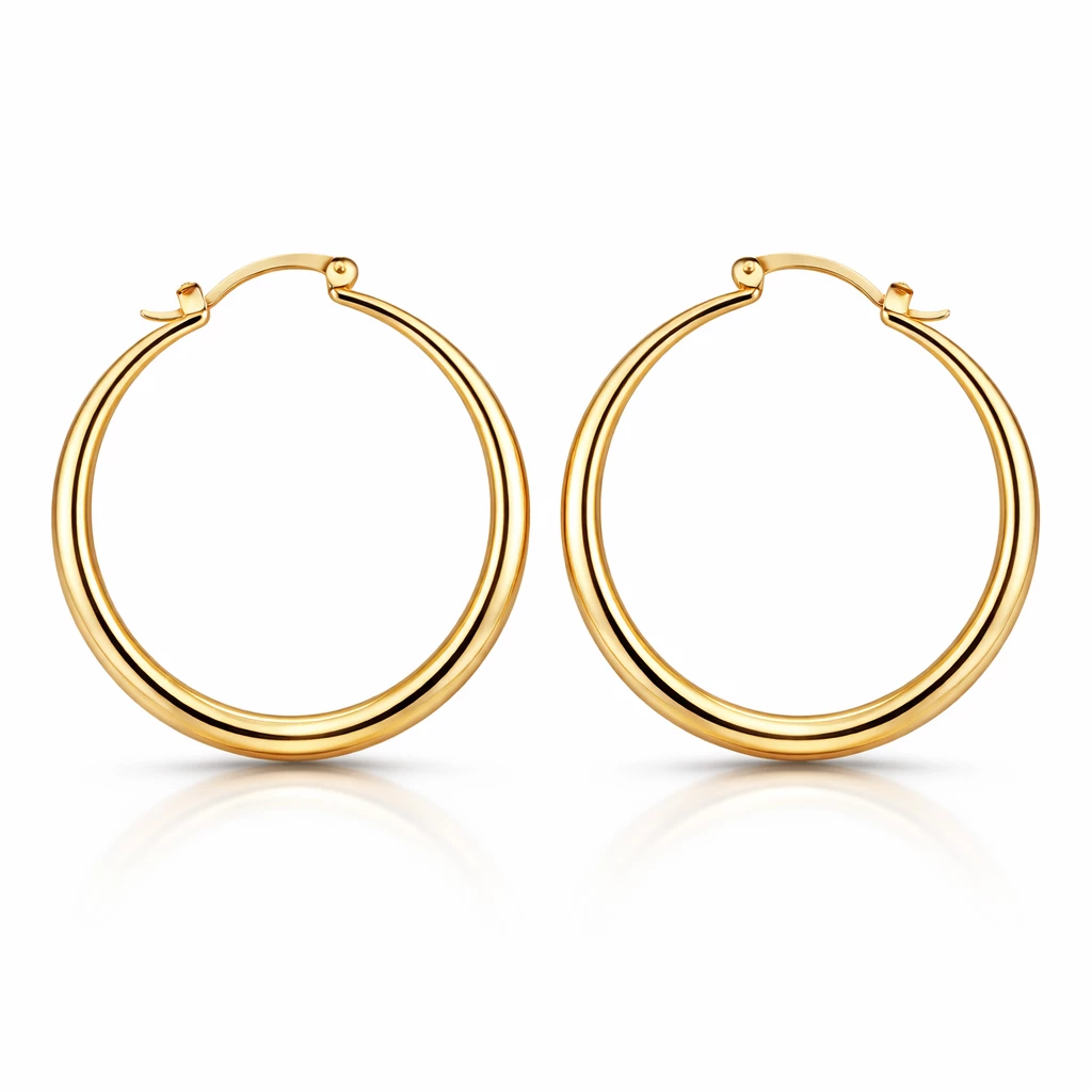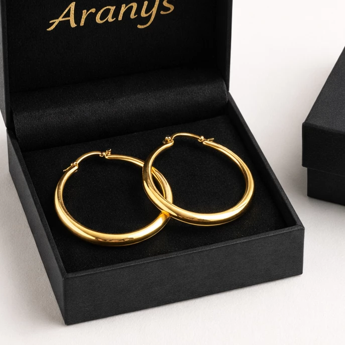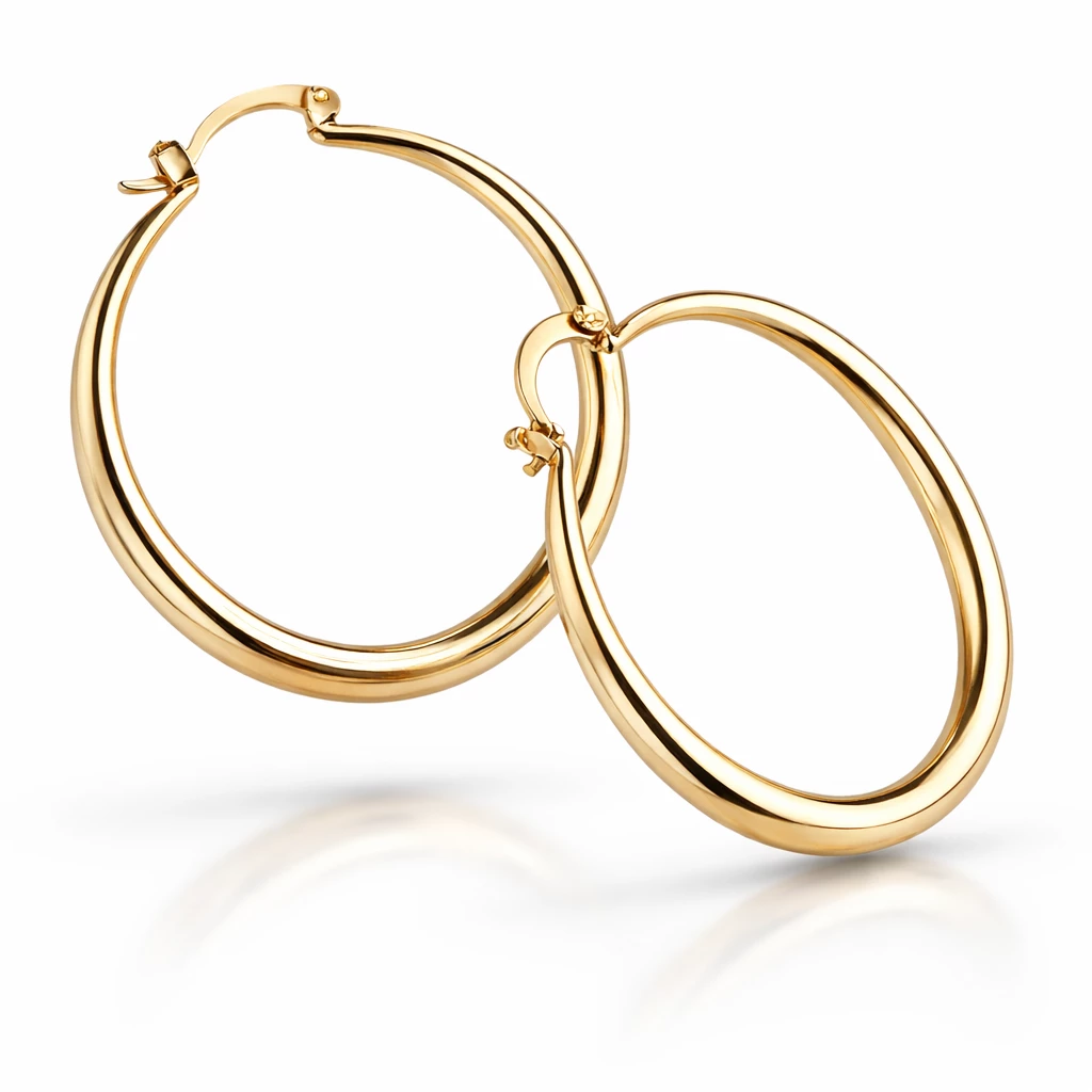 Elegantní kruhové náušnice z nerezové oceli, zlacené 14kt zlatem. Nadčasový tvar, který doladí každý outfit – průměr 4 cm (40 mm), lehké a pohodlné na nošení.