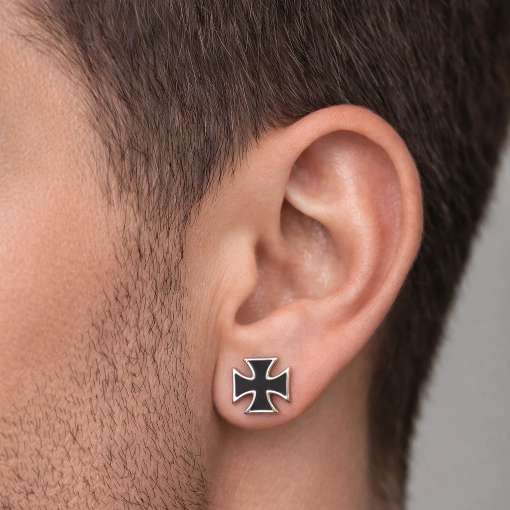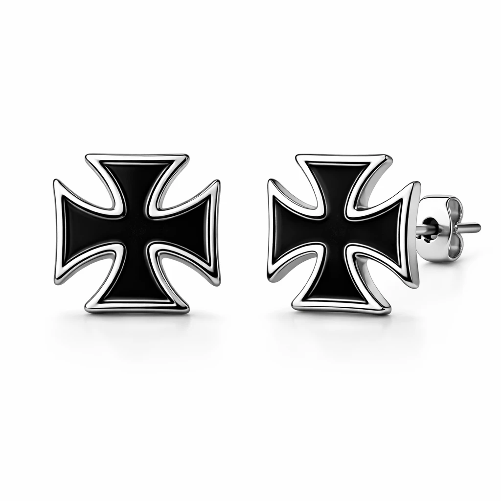 Výrazné náušnice z chirurgické oceli s motivem maltézského kříže a černým smaltem působí odvážně, moderně a dodají outfitu osobitý styl.