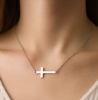 Ocelový dámský náhrdelník s motivem křížku, který je součástí náhrdelníku.