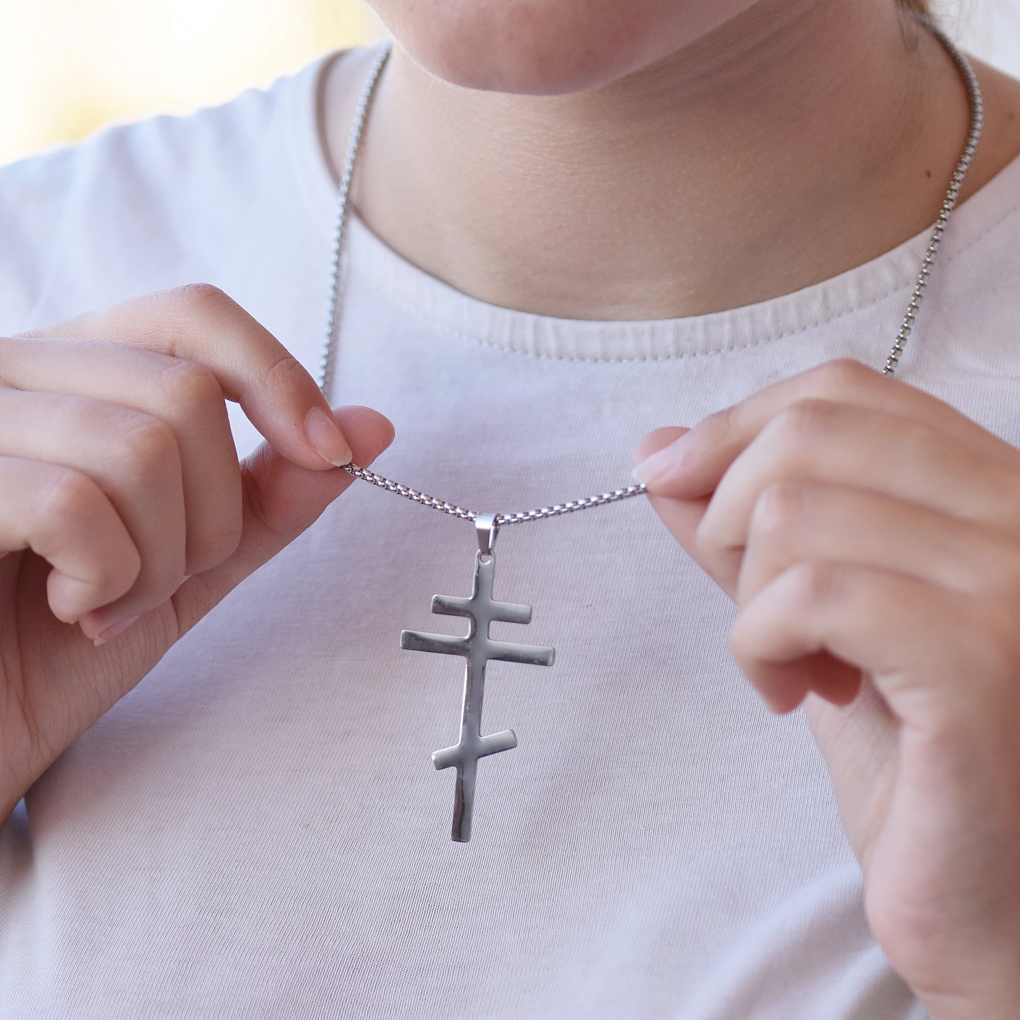 Ocelový náhrdelník s atypickým motivem kříže, který je součástí náhrdelníku.