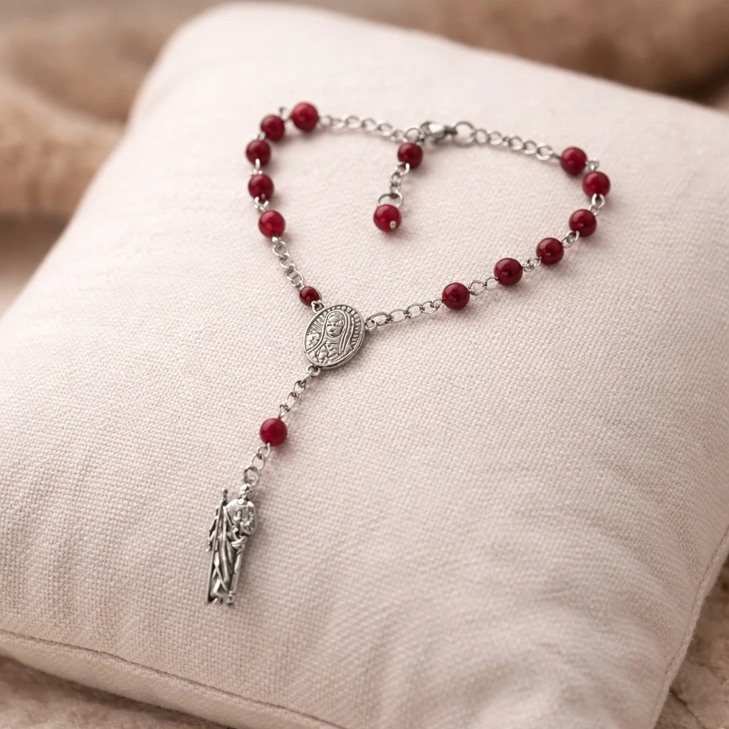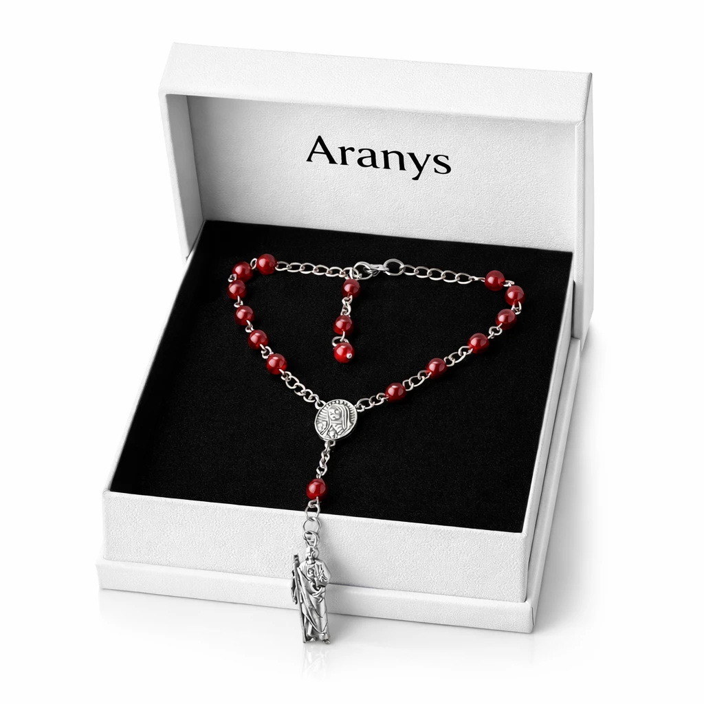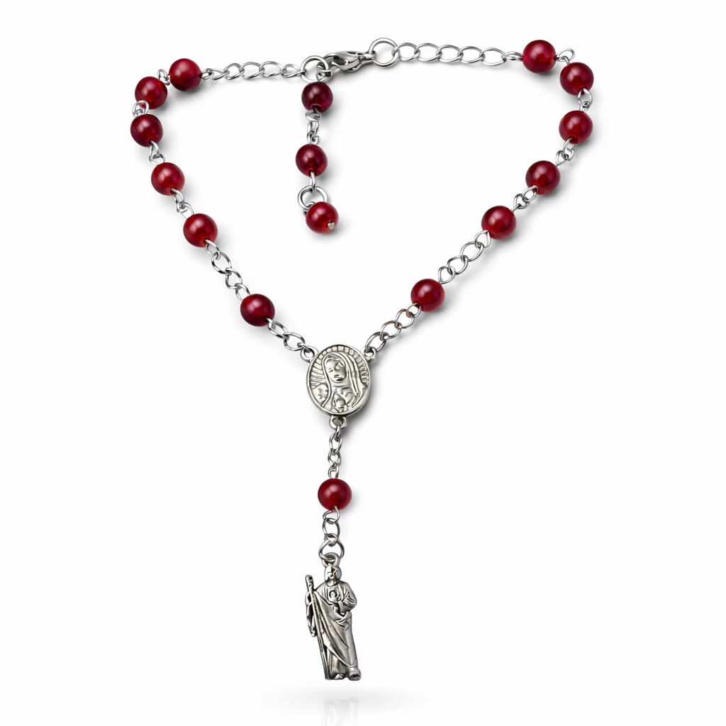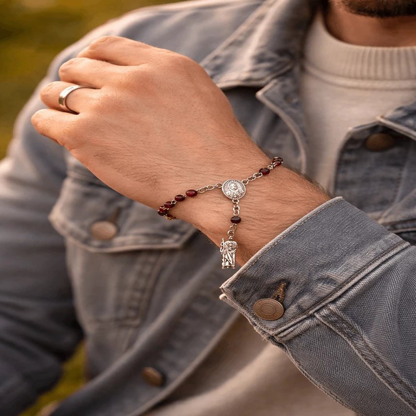 Ocelový náramek svatý Juda s českým granátem je silným symbolem naděje, ochrany a vnitřní síly. Elegantní šperk, který v sobě spojuje hluboký význam a nadčasový design pro každodenní nošení.