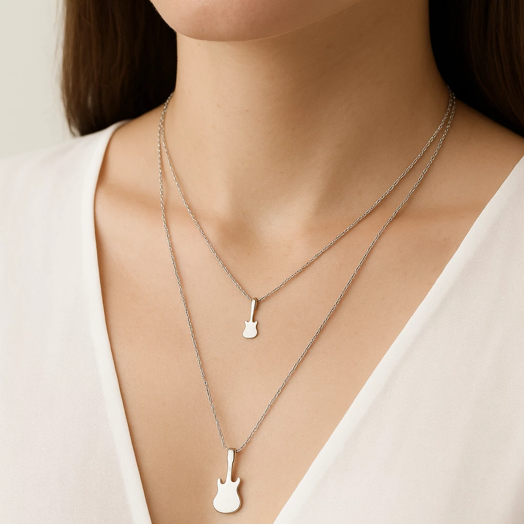 Přívěsek z chirurgické oceli ve tvaru kytary.