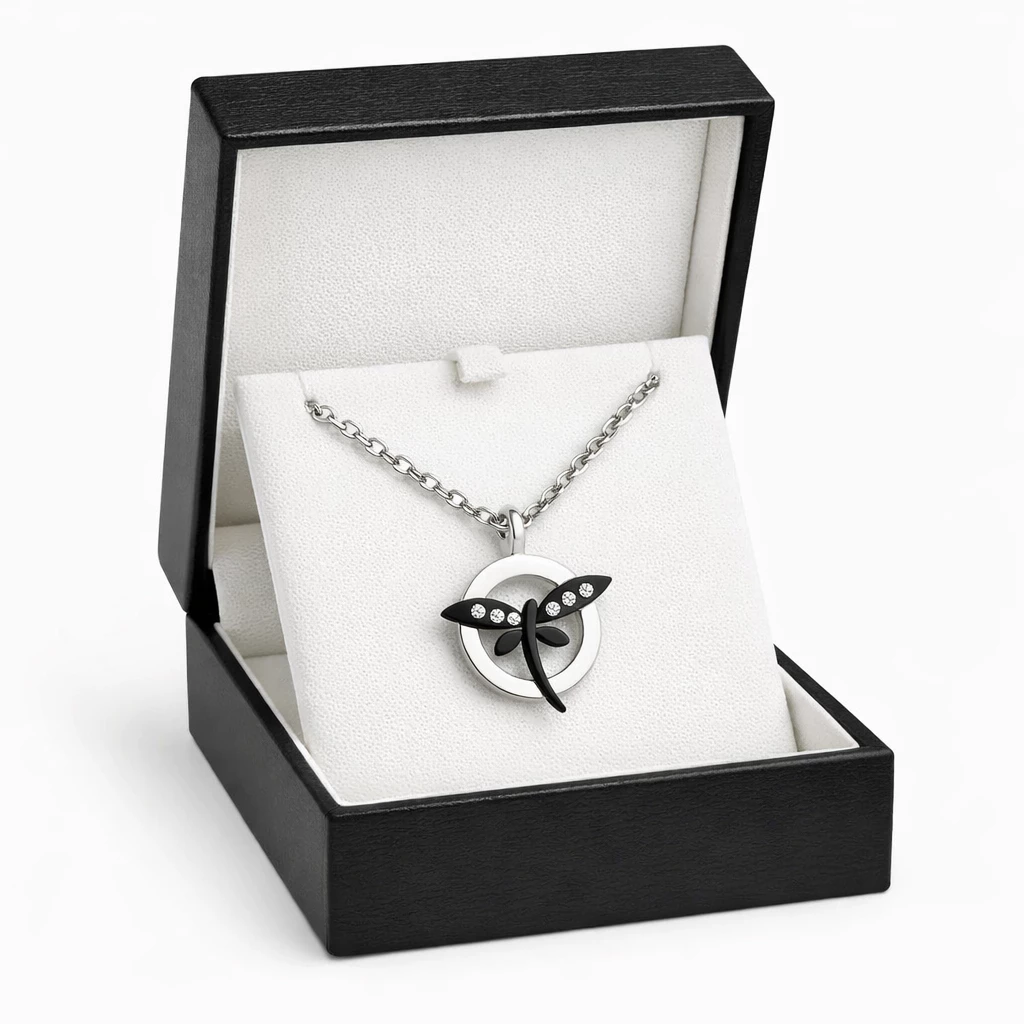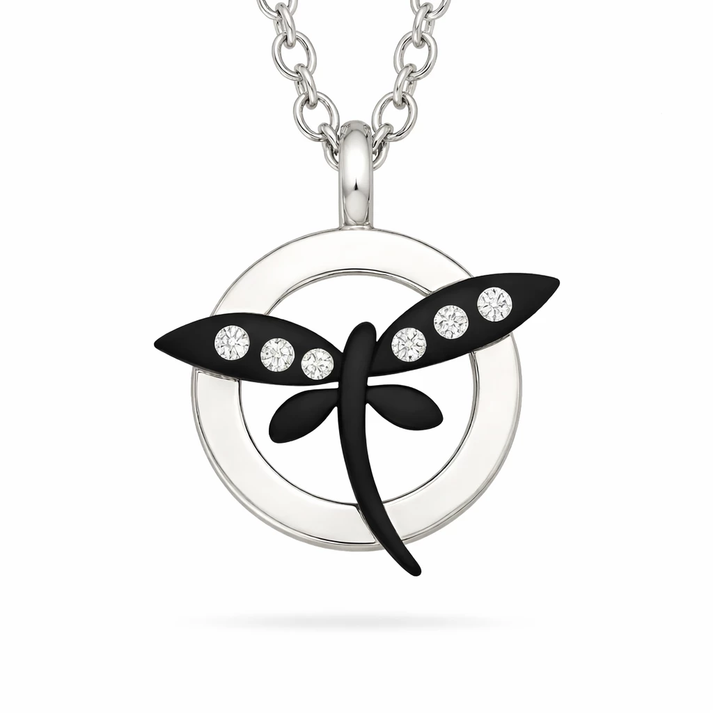 Ocelový přívěsek vážka se zirkony Zarja je moderní šperk z chirurgické oceli, který kombinuje jemný symbol vážky s výraznými zirkony (kubická zirkonie) pro elegantní třpyt.