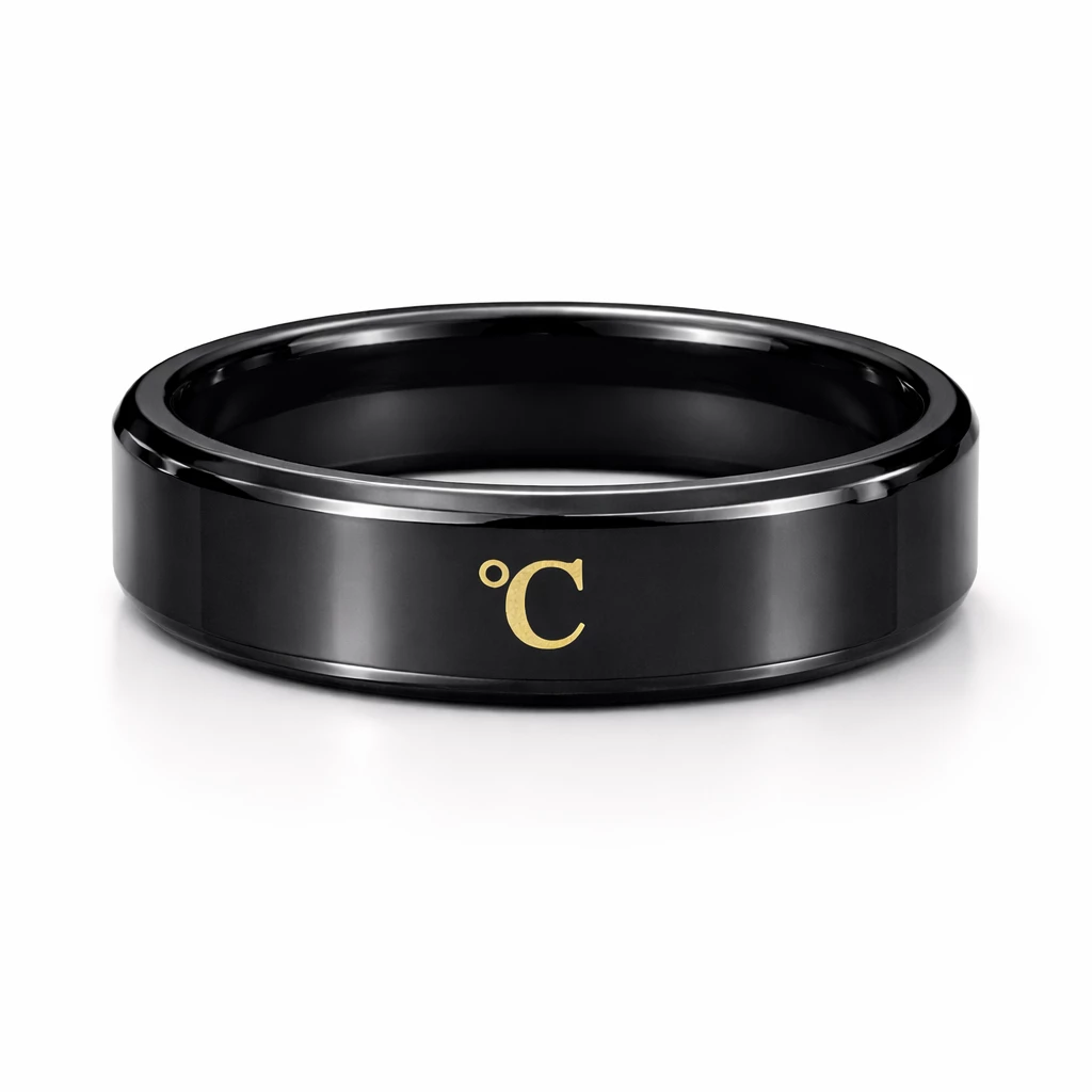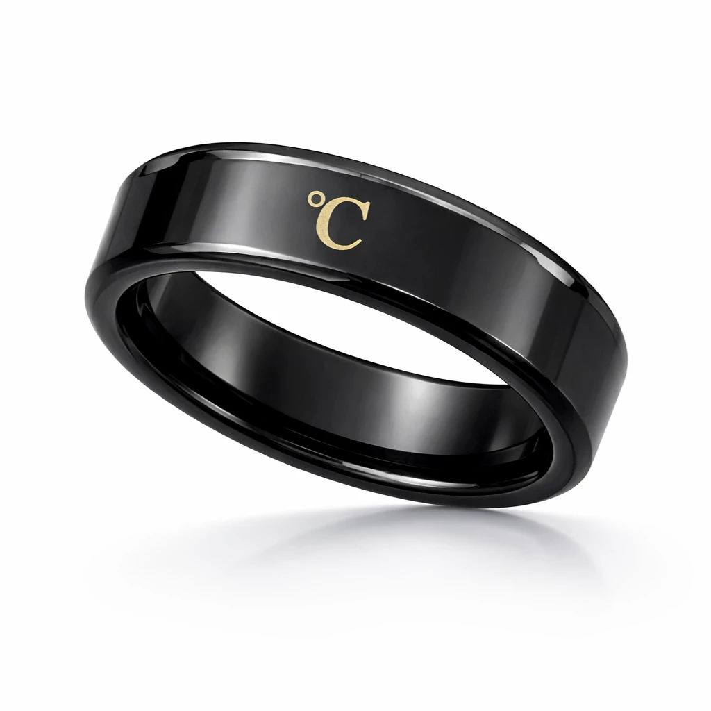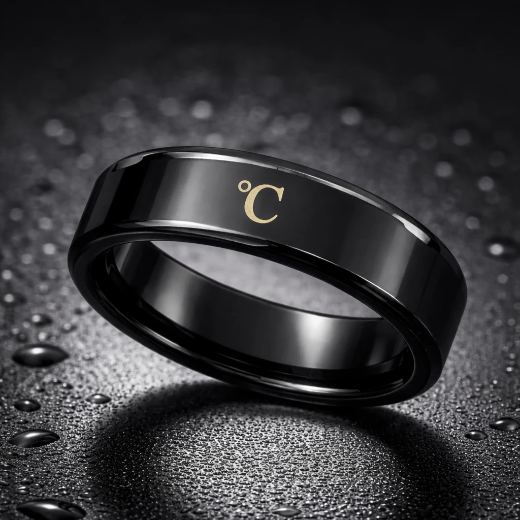 Stylový černý ocelový prsten, který snímá tělesnou teplotu. Pořiďte si tento funkční šperk.