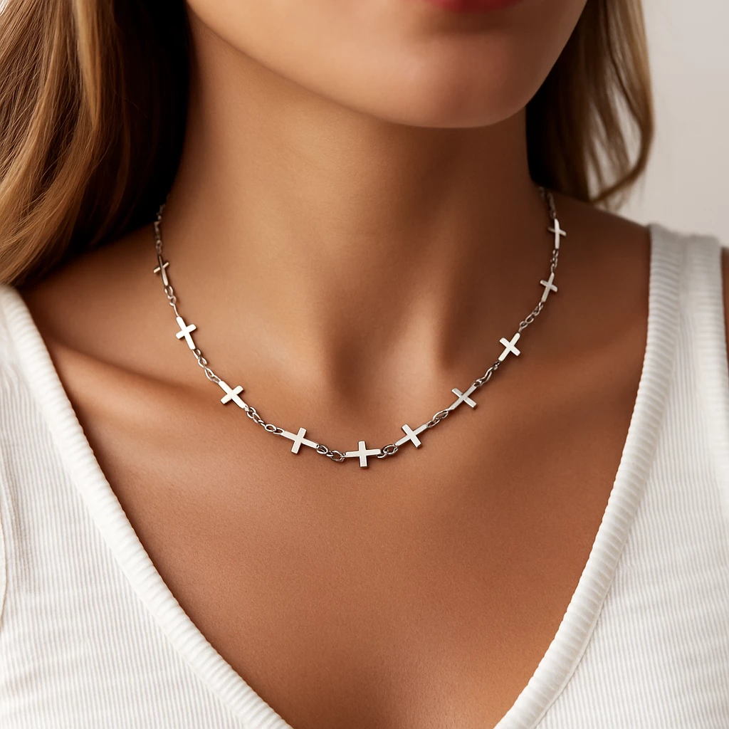 Náhrdelník z chirurgické oceli zdobený motivem malých křížků.