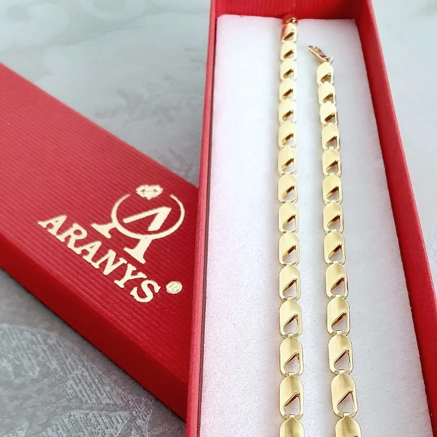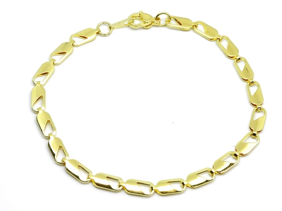 Zlacený ocelový náramek z chirurgické oceli je zlacený 14 karátovým zlatem. Zajímavá hladká očka dodávají náramku na zajímavosti.