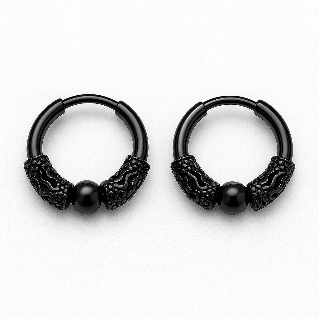 Slušivé a nadčasové pánské náušnice. Černý kroužek je dozdoben kuličkou a dvěma ornamenty, které dodávají netradiční vzhled. Náušnice mají bezpečné zapínání na zacvaknutí, tudíž se nemusíte bát ztráty. Tento šperk díky černé barvě jednoduše zkombinujete s outfity.
