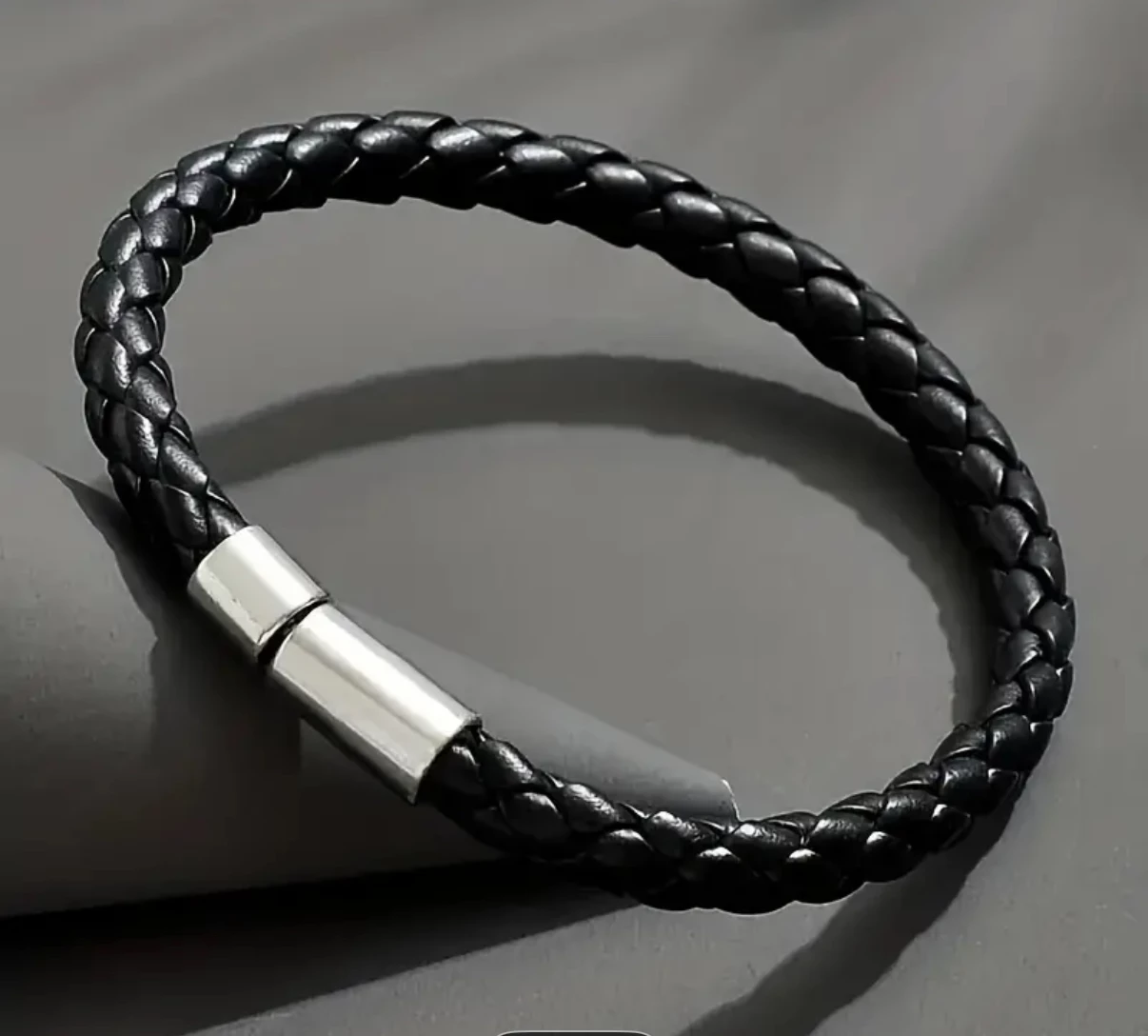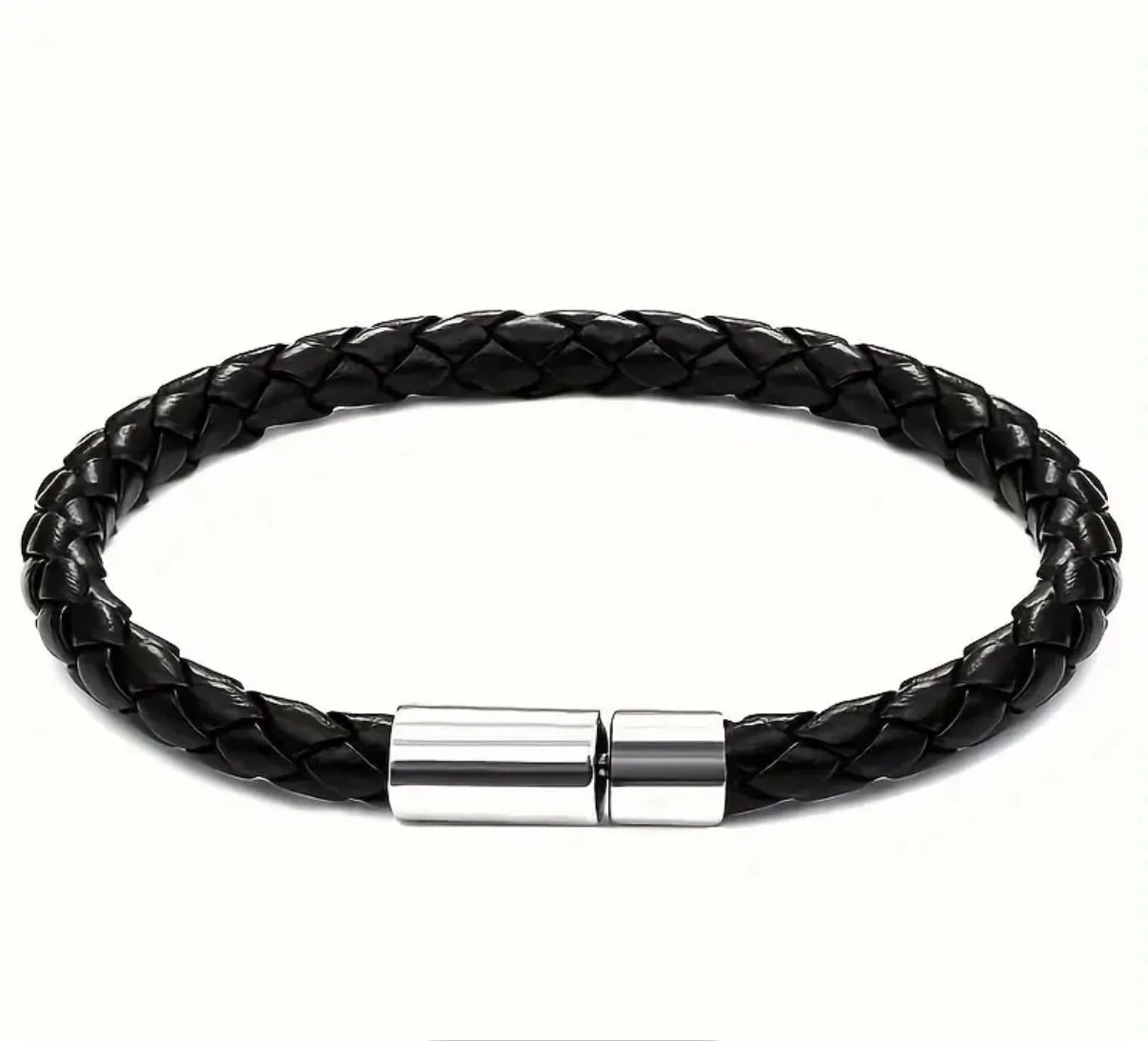 Moc hezký kožený pletený náramek s ocelí určený nejen mužům. Náramek vhodný na každodenní nošení. Černý kožený náramek s praktickým zapínáním z chirurgické oceli.