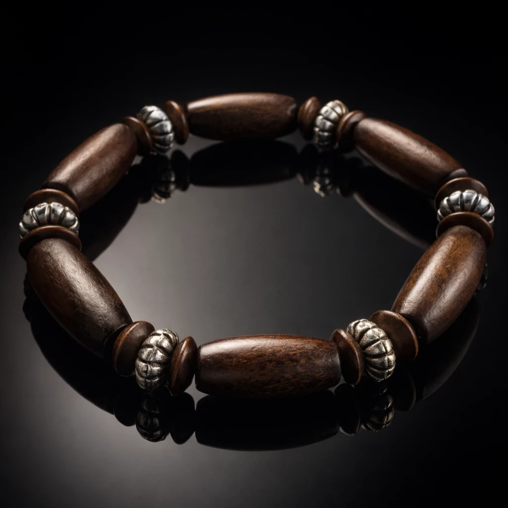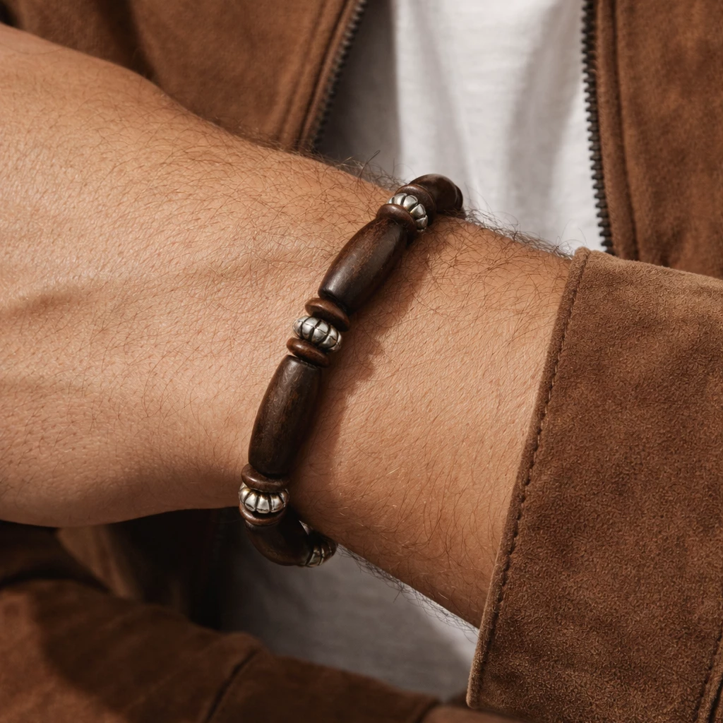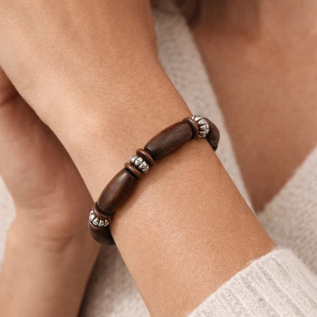 Dřevěný náramek Noir Wood je stylový doplněk, který propojuje přírodní krásu dřeva s jemnými kovovými prvky. Jeho minimalistický design působí přirozeně, elegantně a snadno se kombinuje s každodenním outfitem.