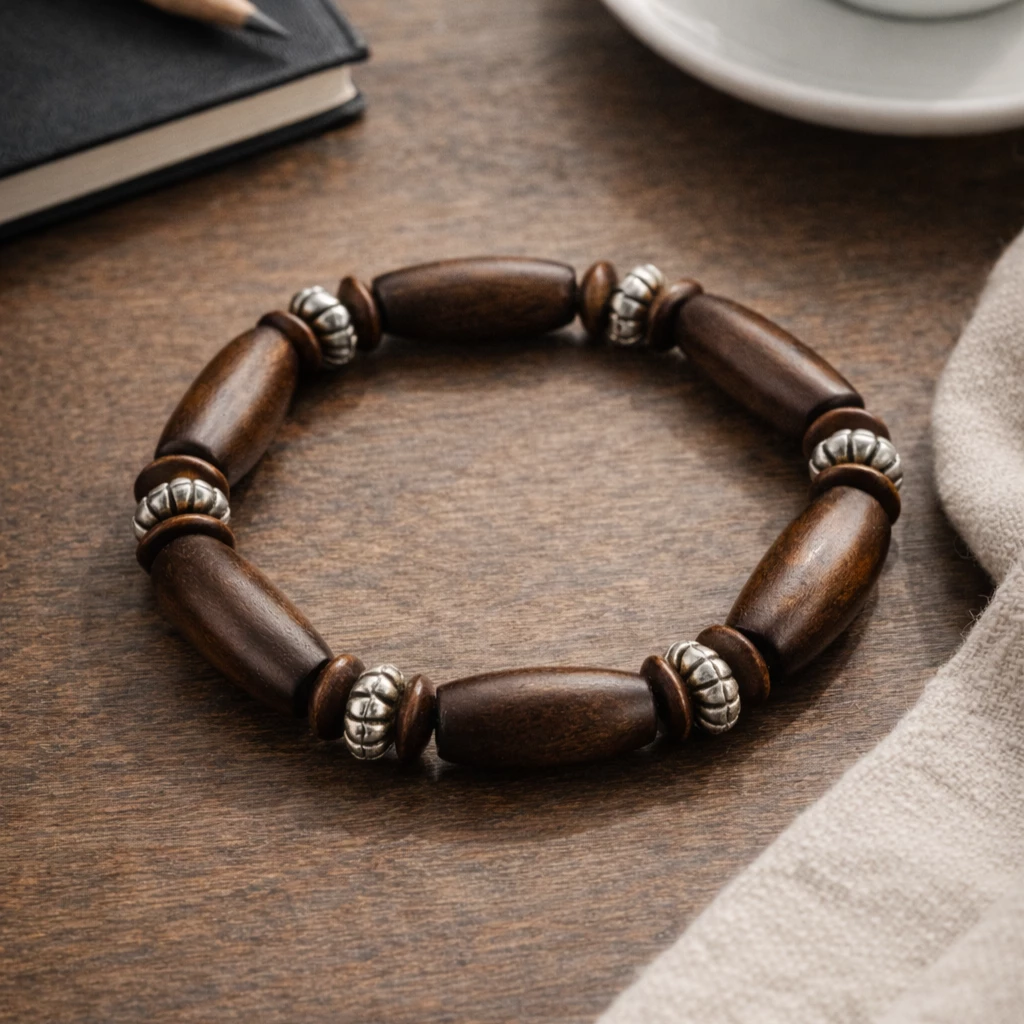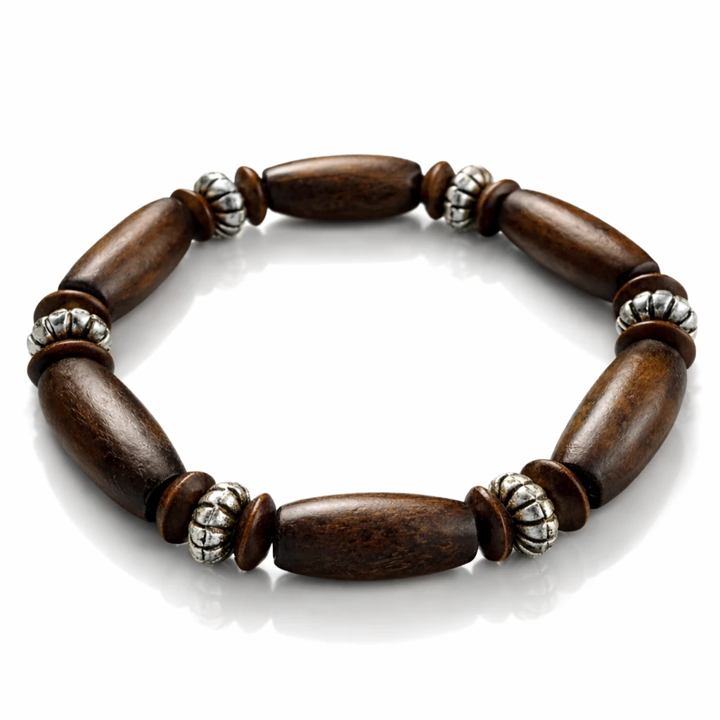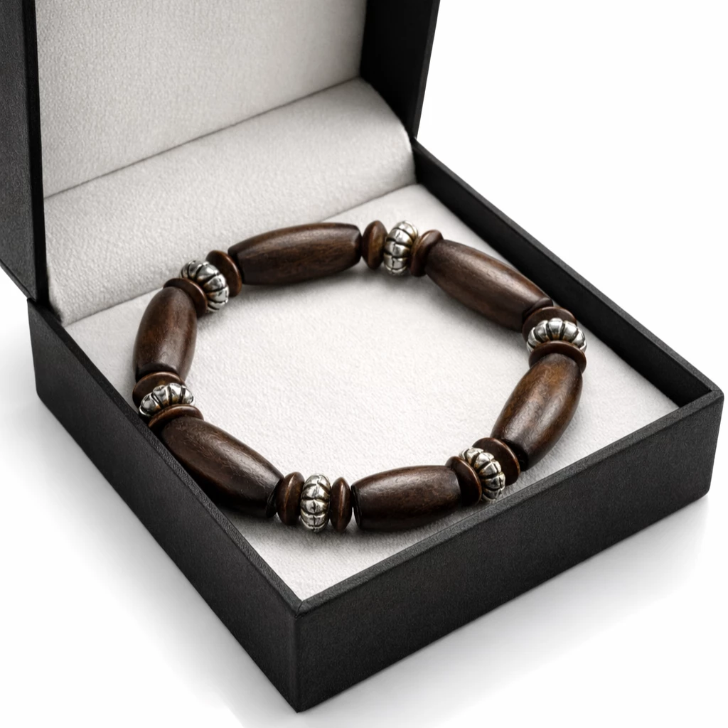 Dřevěný náramek Noir Wood je stylový doplněk, který propojuje přírodní krásu dřeva s jemnými kovovými prvky. Jeho minimalistický design působí přirozeně, elegantně a snadno se kombinuje s každodenním outfitem.