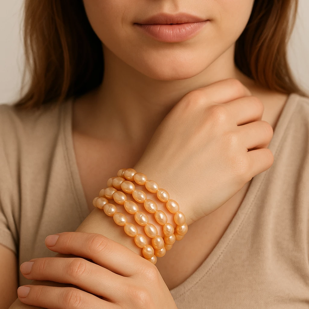 Krásný náramek z perliček v půvabném lososovém odstínu působí jemně a romanticky.