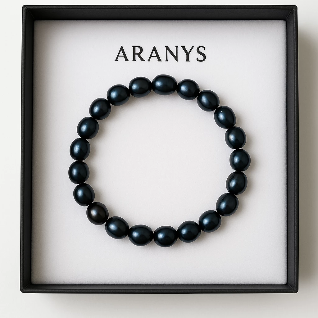 Tento nádherný náramek z pravých černých říčních perel je symbolem elegance, jemnosti a ženské síly. Perly vynikají svým hlubokým tmavým odstínem s odlesky modré a fialové, které vytvářejí luxusní a tajemný efekt.