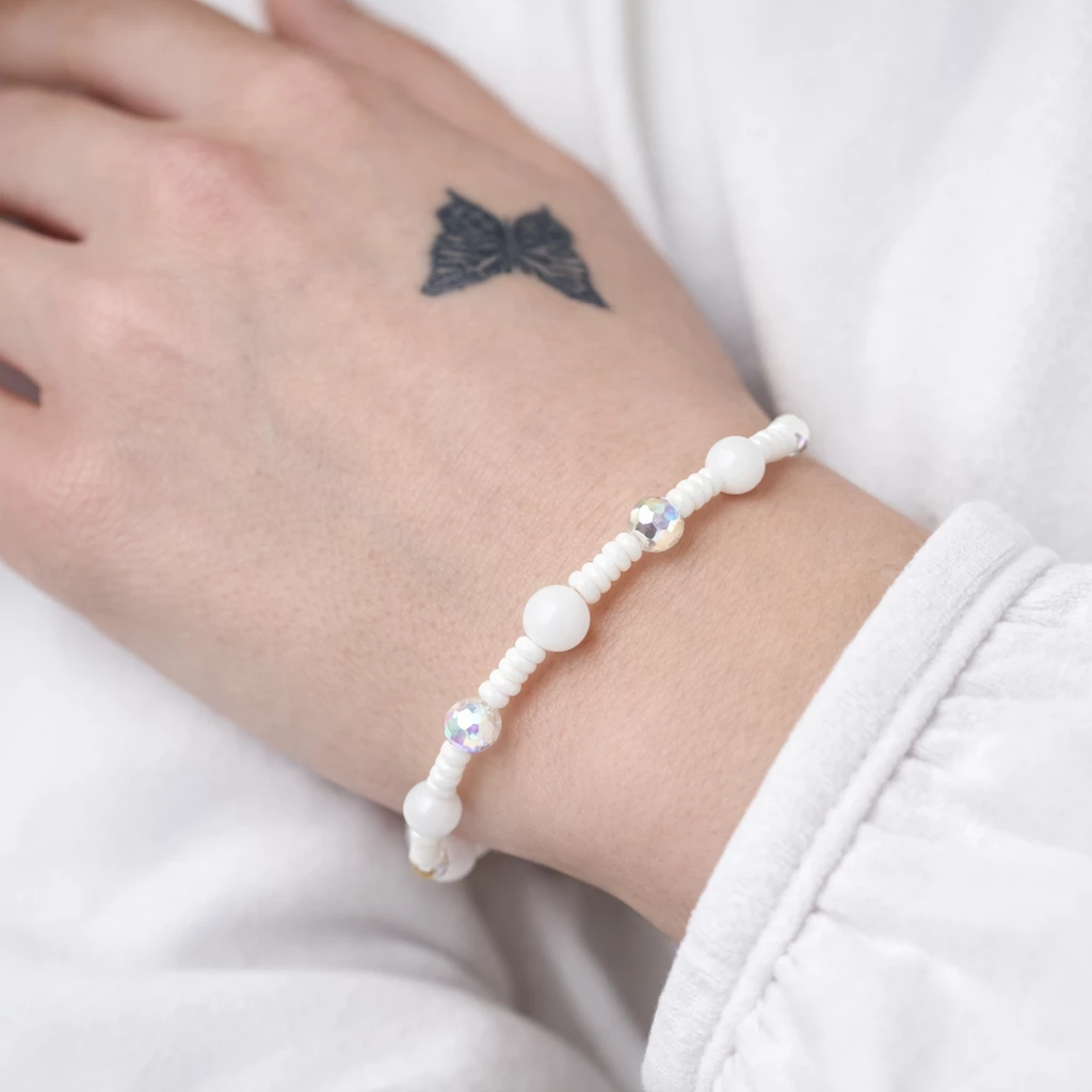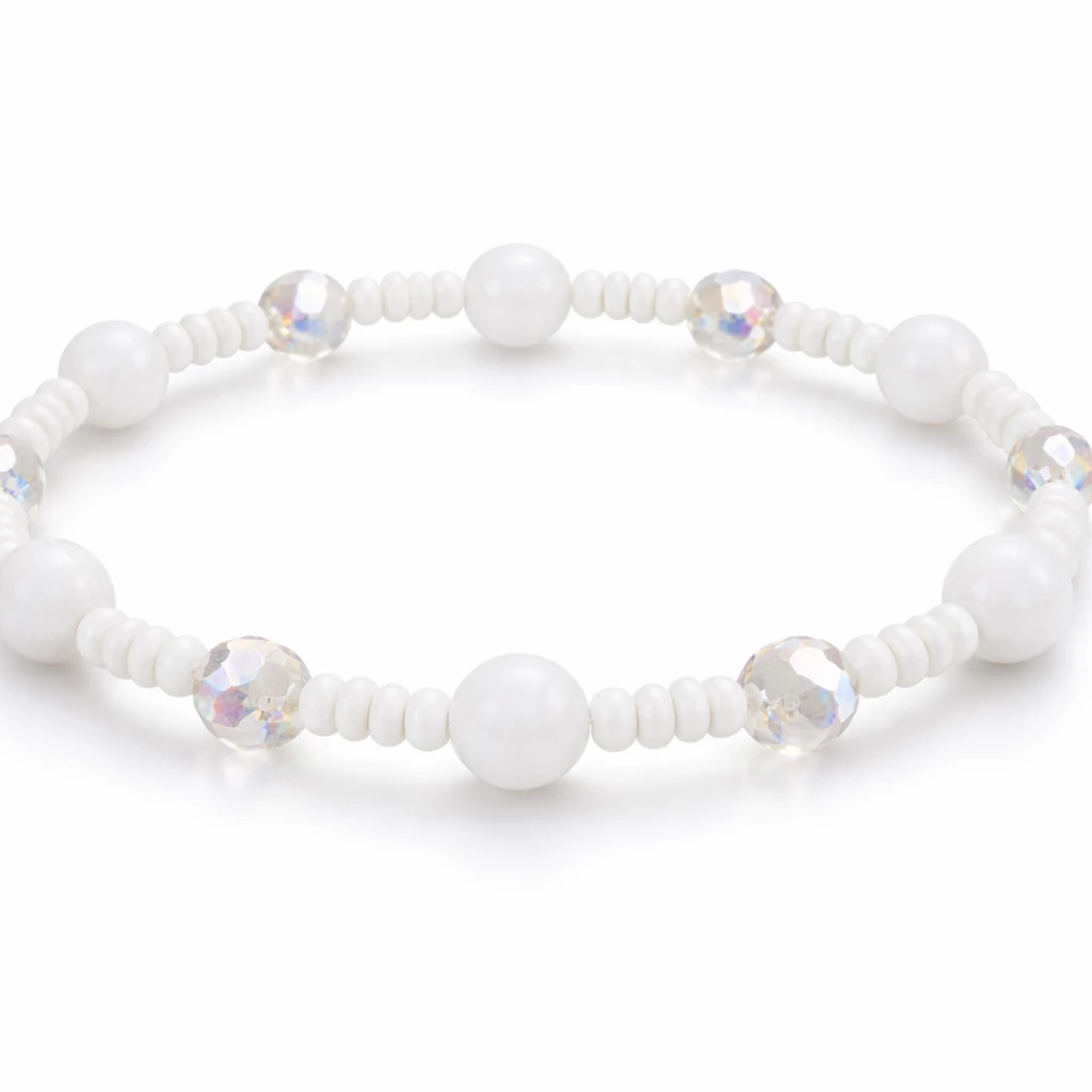 Elegantní náramek lesklé bílé barvy. Je tvořen bílými bižuterními korálky v různých velikostech. Korálky jsou navlečené na pružné šperkařské gumičce.