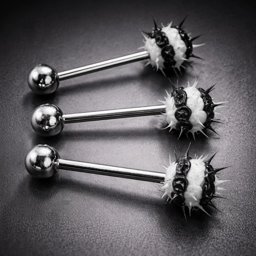 Stylový ocelový piercing do jazyka s dekorativní střapatou kuličkou, která vytváří jedinečný a nepřehlédnutelný efekt. Netypický tvar dodává šperku hravost a originalitu, díky čemuž skvěle doplní výraznější styl.