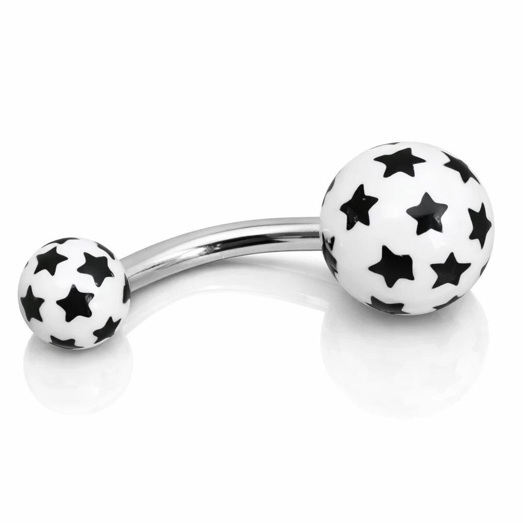 Stylový piercing do pupíku s tyčinkou z chirurgické oceli a dekorativními plastovými kuličkami s motivy hvězd nebo květin. Výrazné kontrastní vzory dodávají šperku hravý vzhled a dělají z něj zajímavý doplněk pro každý den.