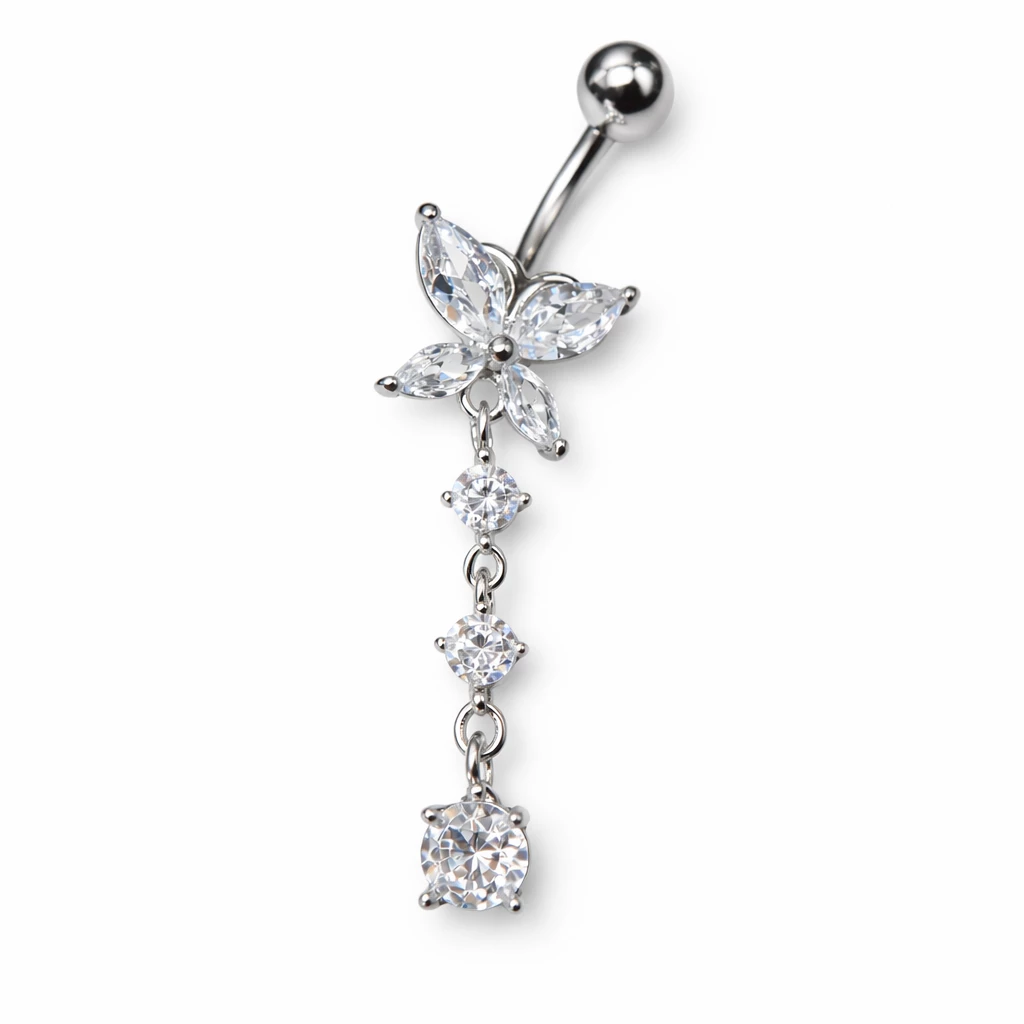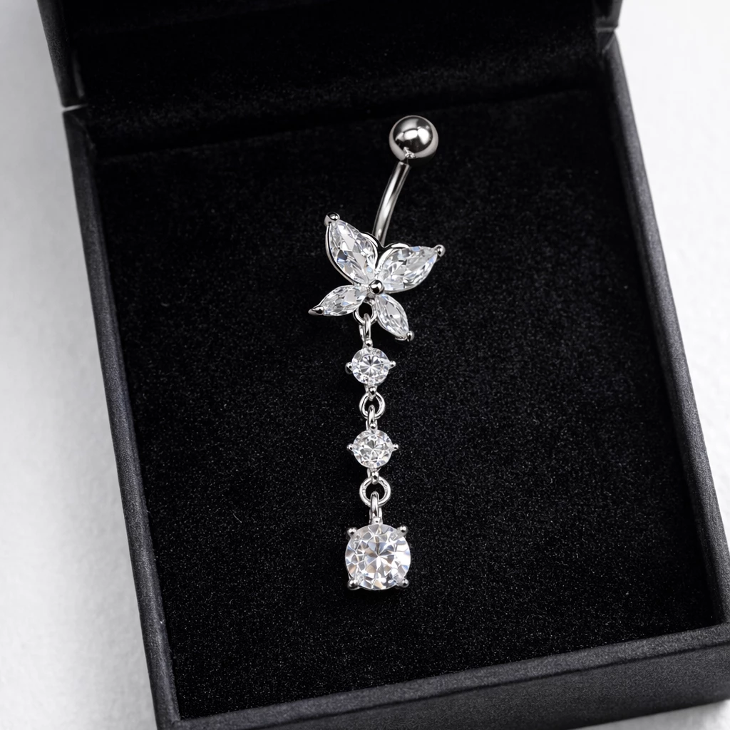 Ocelový piercing do pupíku motýl se zirkony je elegantní šperk s jemným designem, který zaujme třpytem zirkonů a pohyblivým přívěskem ve tvaru motýla. Tento detail dodává šperku lehkost a zároveň výrazný efekt při každém pohybu.