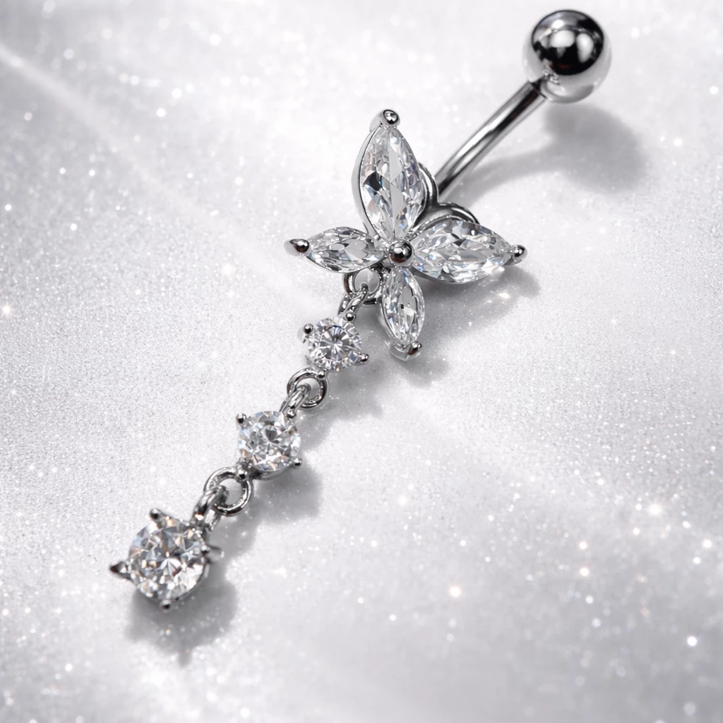 Piercing s motýlem propojuje lehkost, krásu a třpyt v nadčasový šperk plný elegance.