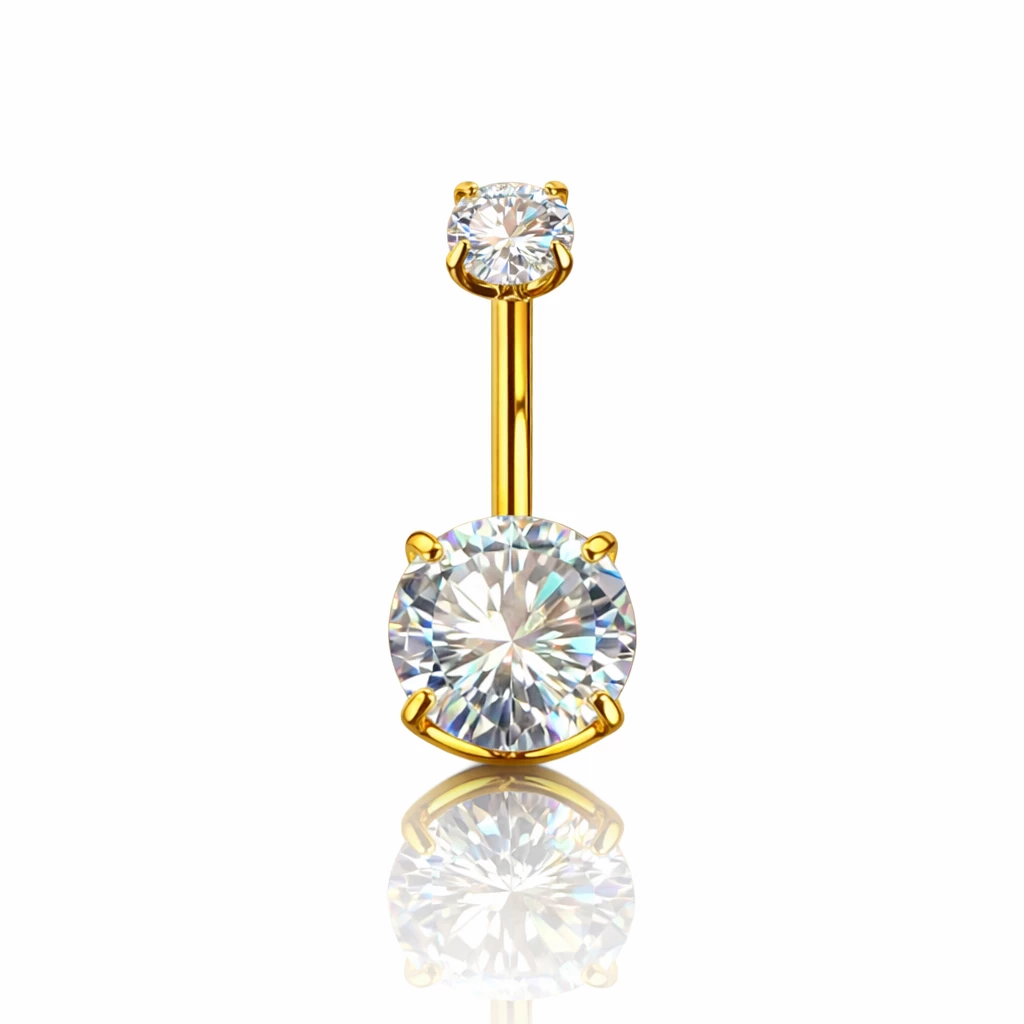 Stylový piercing do pupíku z chirurgické oceli se zlatou povrchovou úpravou zdobený třpytivými zirkony, které dodávají šperku výrazný lesk a elegantní vzhled. Jednoduchý a čistý design je ideální pro každodenní nošení i speciální příležitosti.