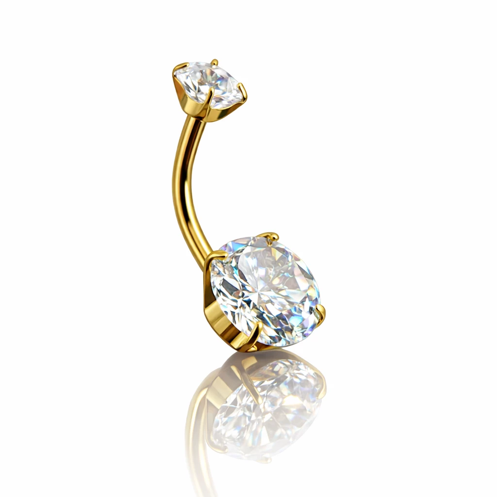 Ocelový zlacený piercing do pupíku se zirkony zaujme minimalistickým a elegantním designem a výrazným třpytem kamenů. Šperk z chirurgické oceli se zlatou povrchovou úpravou působí luxusně a nadčasově.