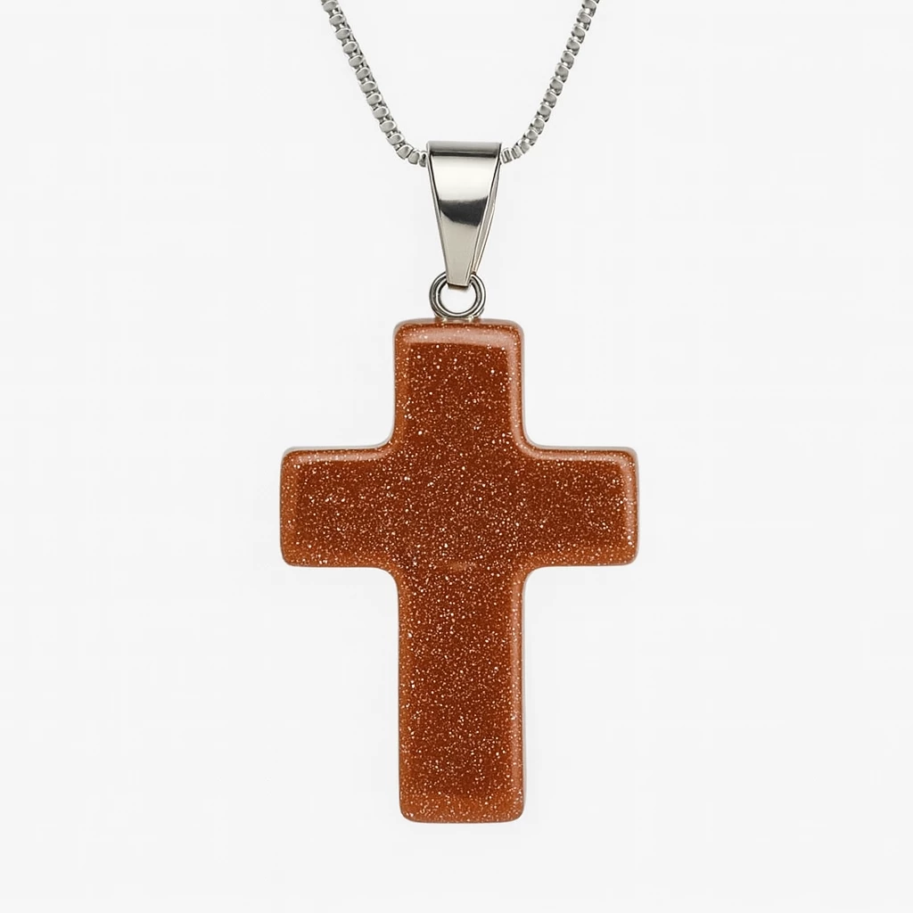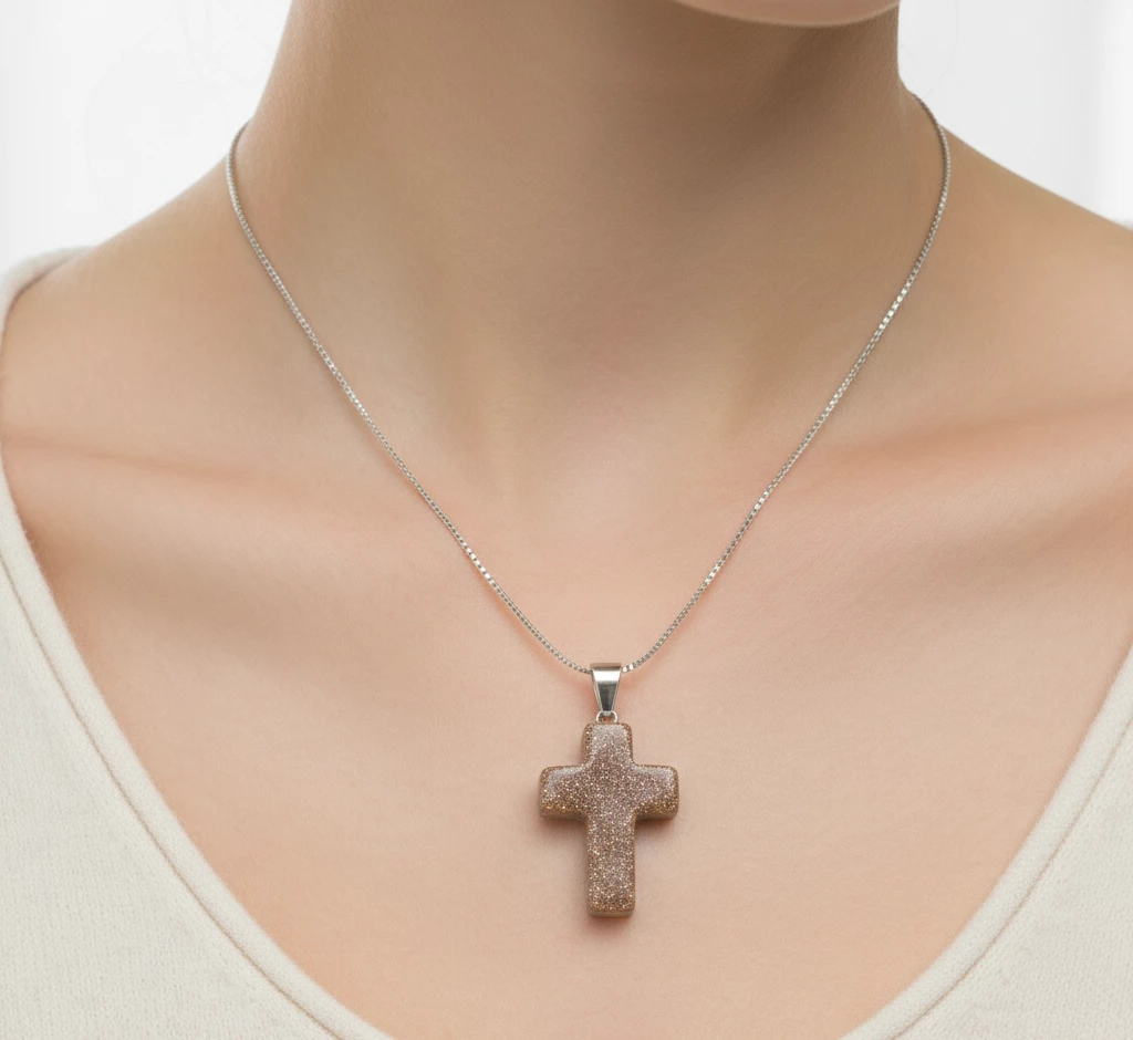 Kameny a šperky s kameny patří mezi svůdné módní trendy, které se nikdy neomrzí. Ozdobte svůj dekolt krásným třpytivým avanturínem, který si zavěsíte například na kůži nebo řetízek. Syntetický avanturín ve tvaru křížku.