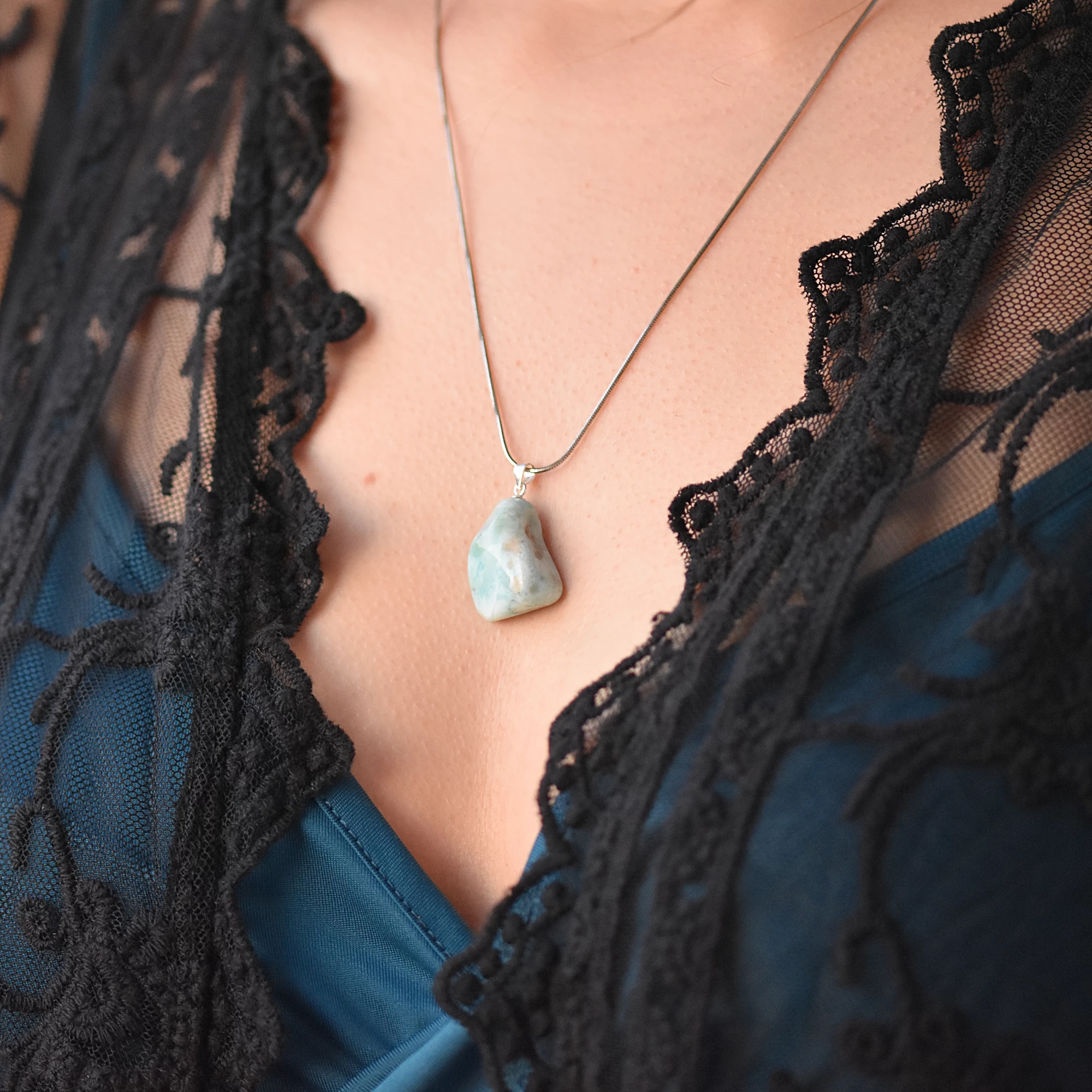Stříbrný přívěsek, kterému dominuje léčivý kámen larimar. Kámen je naprosto jedinečný, má nádhernou kresbu a okouzlující modrou barvu. Vhodný pro zavěšení na šňůrku nebo řetízek, který je třeba k přívěsku dokoupit. Bude krásnou ozdobou Vašeho dekoltu.