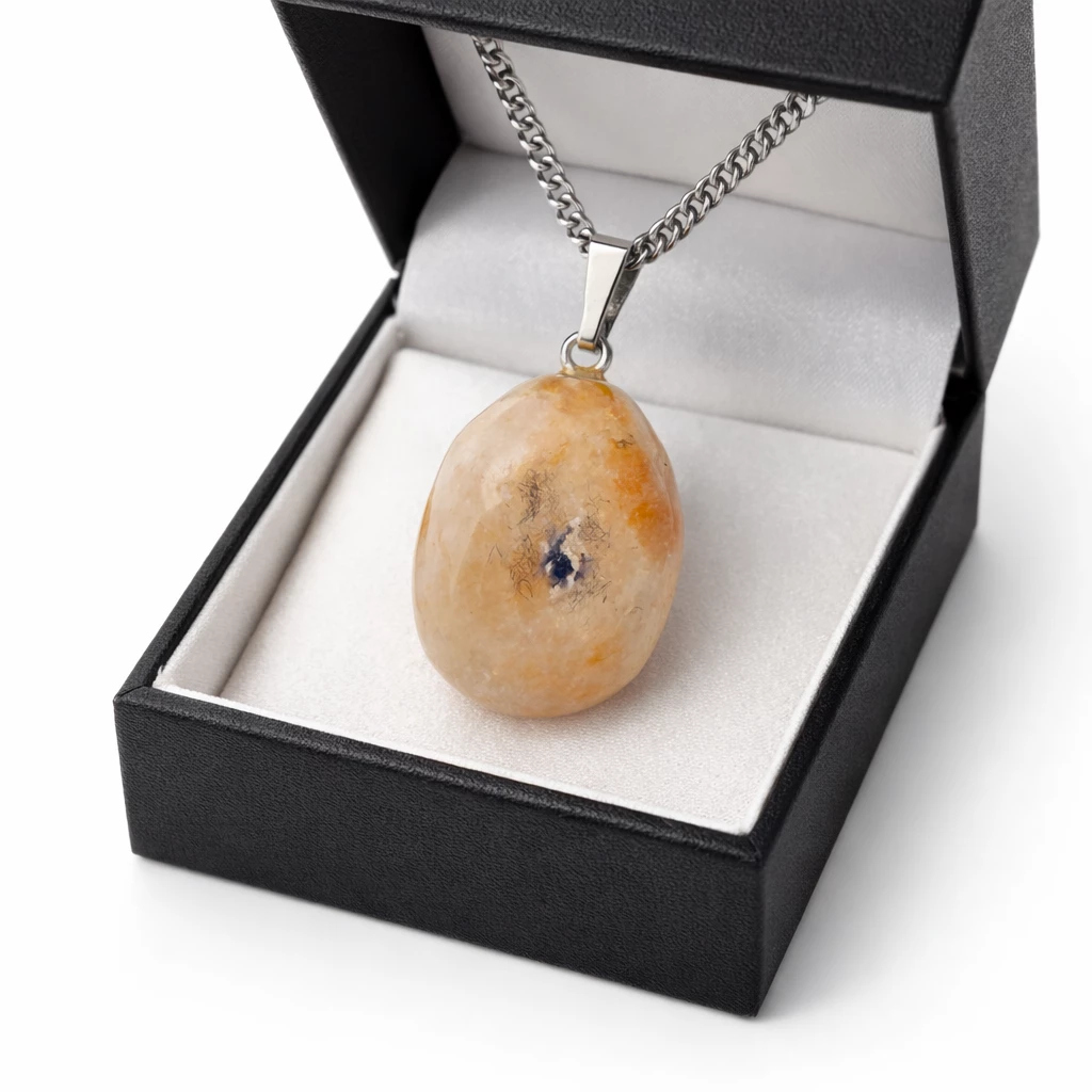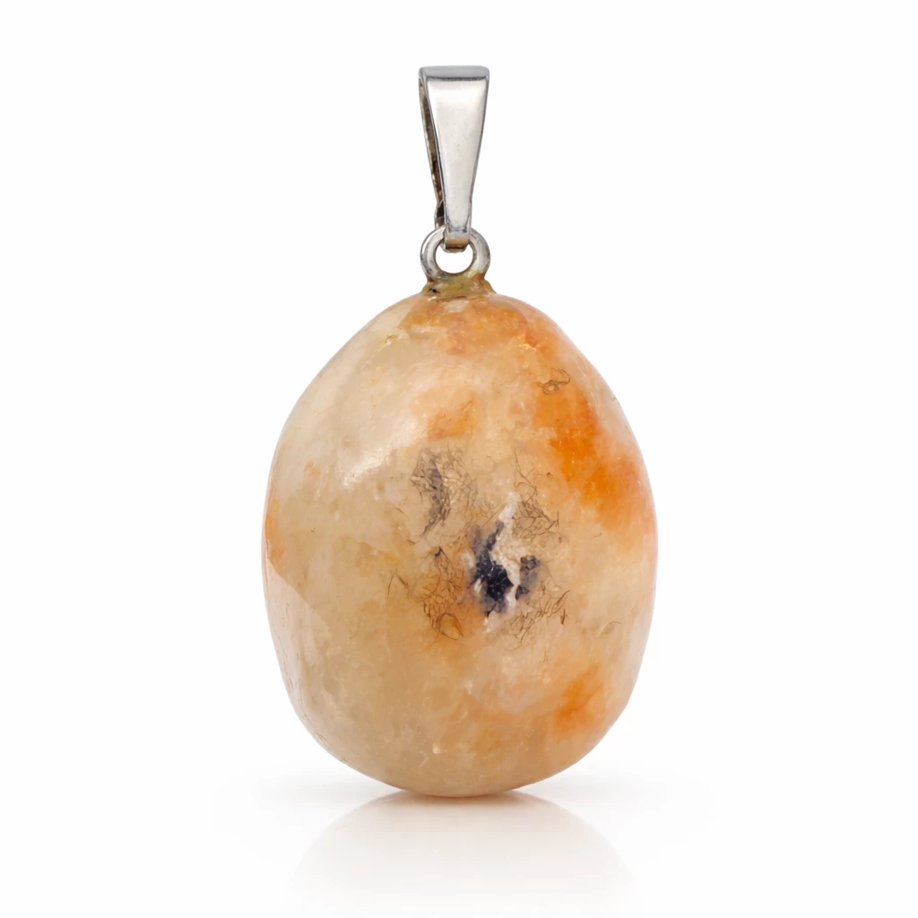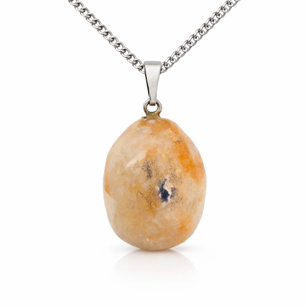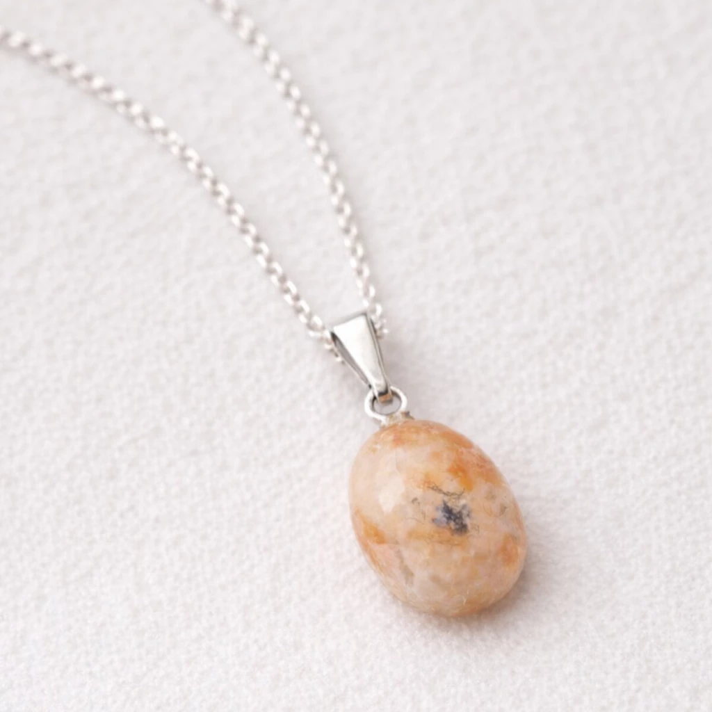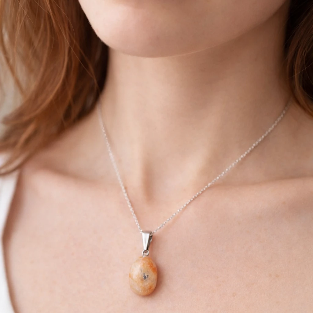 Přívěsek se slunečním kamenem Solara je tvořen výrazným minerálem v teplých odstínech oranžové, krémové a jemně zlatavé barvy. Nepravidelný tvar dodává šperku přirozený a autentický vzhled.