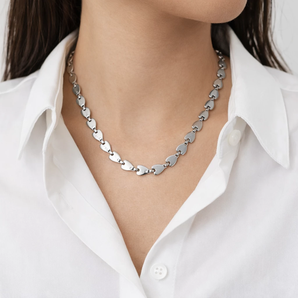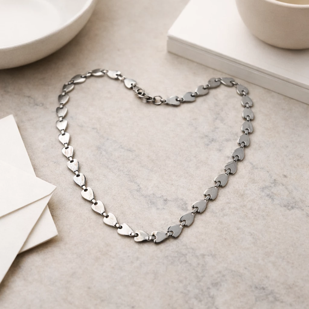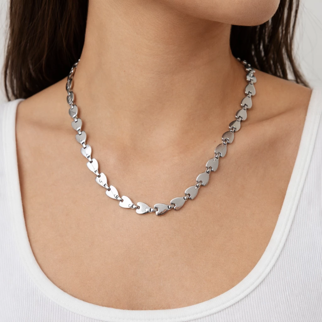 Elegantní náhrdelník z nerezové oceli tvořený jemnými články ve tvaru srdcí. Minimalistický design mu dodává nadčasový vzhled a snadno ho sladíš s každodenním i slavnostnějším outfitem.