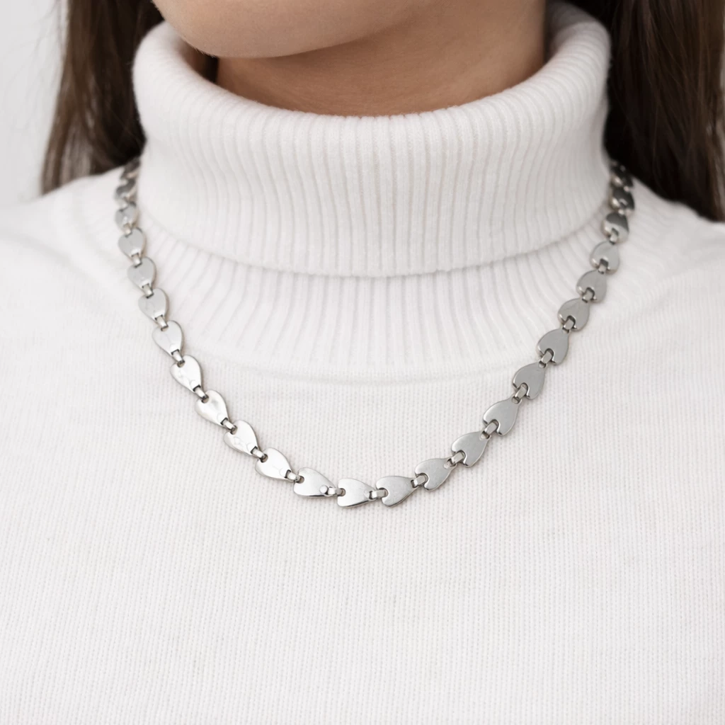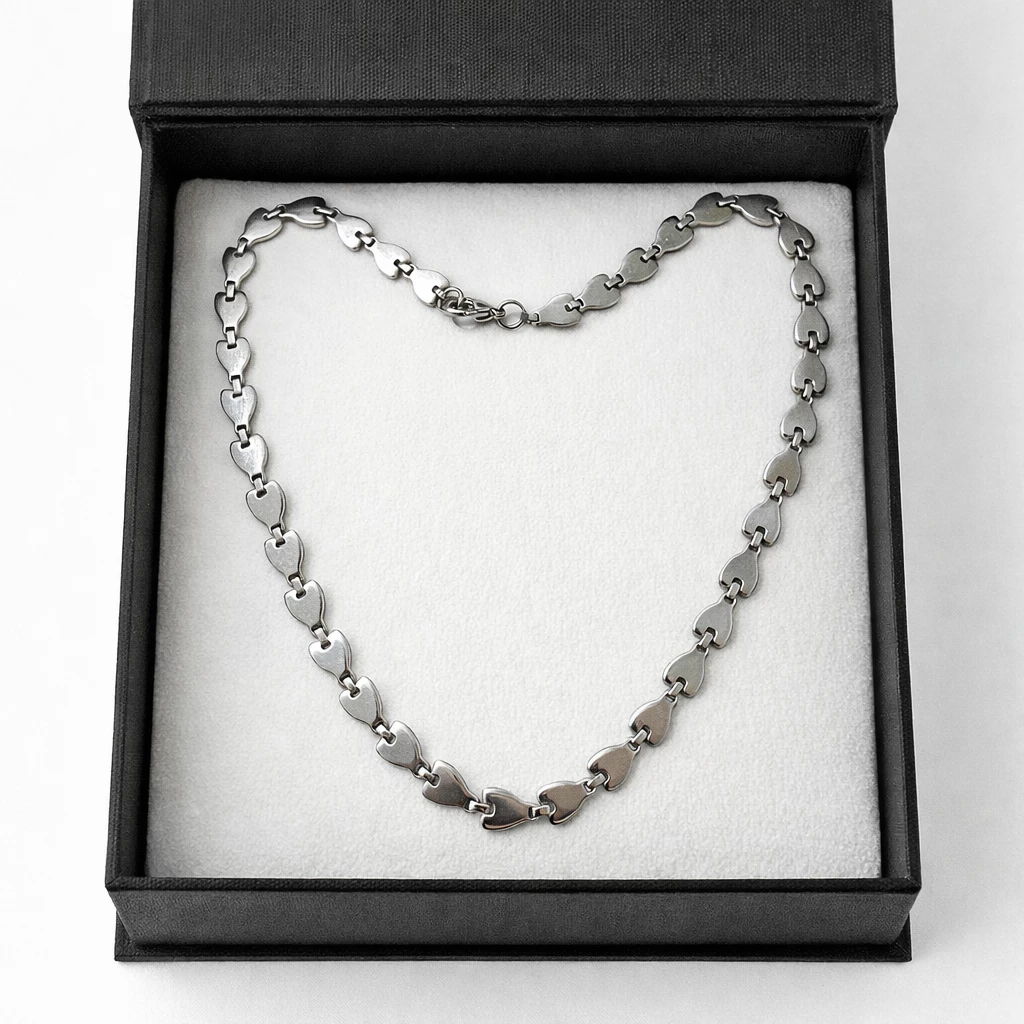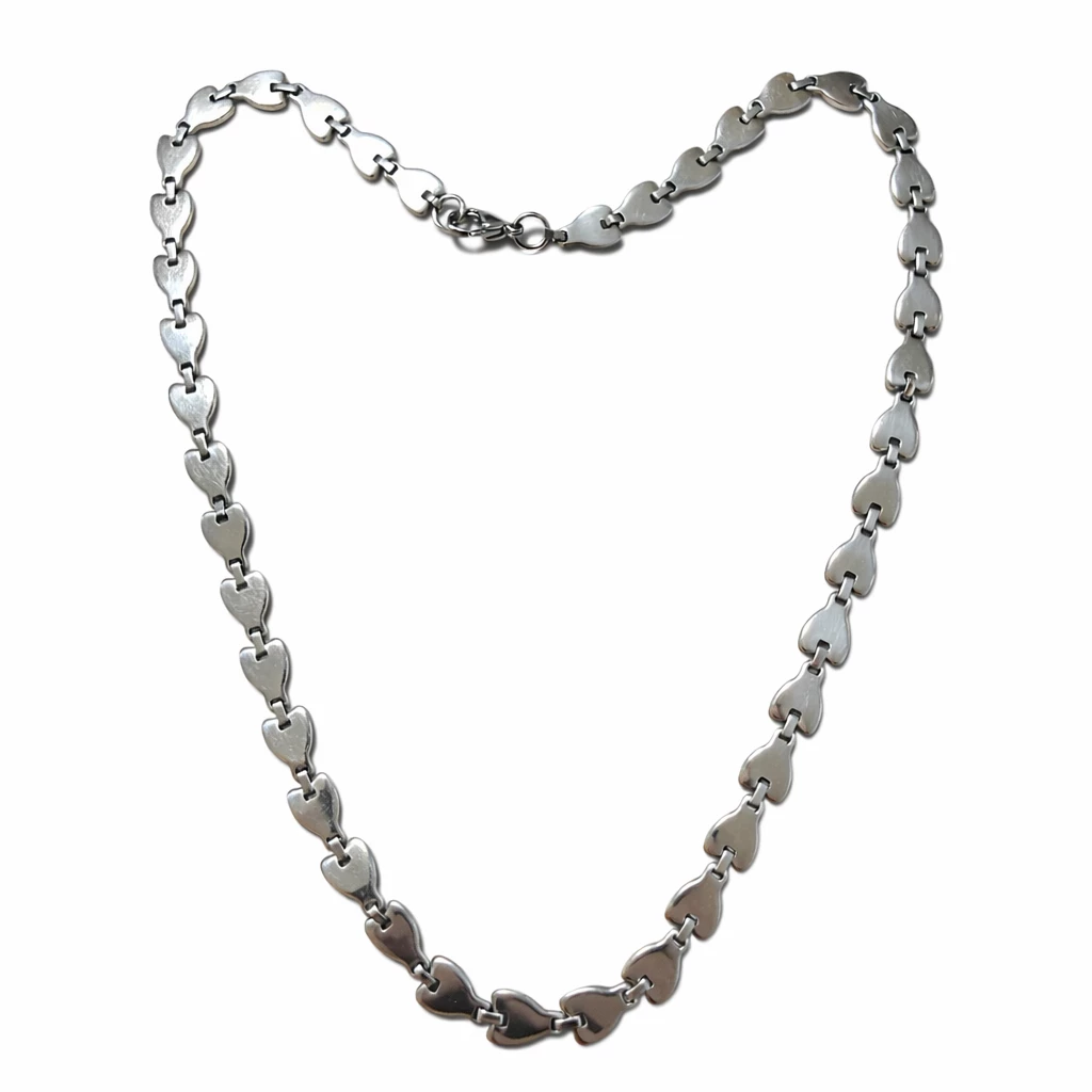 Elegantní náhrdelník z nerezové oceli tvořený jemnými články ve tvaru srdcí. Minimalistický design mu dodává nadčasový vzhled a snadno ho sladíš s každodenním i slavnostnějším outfitem.