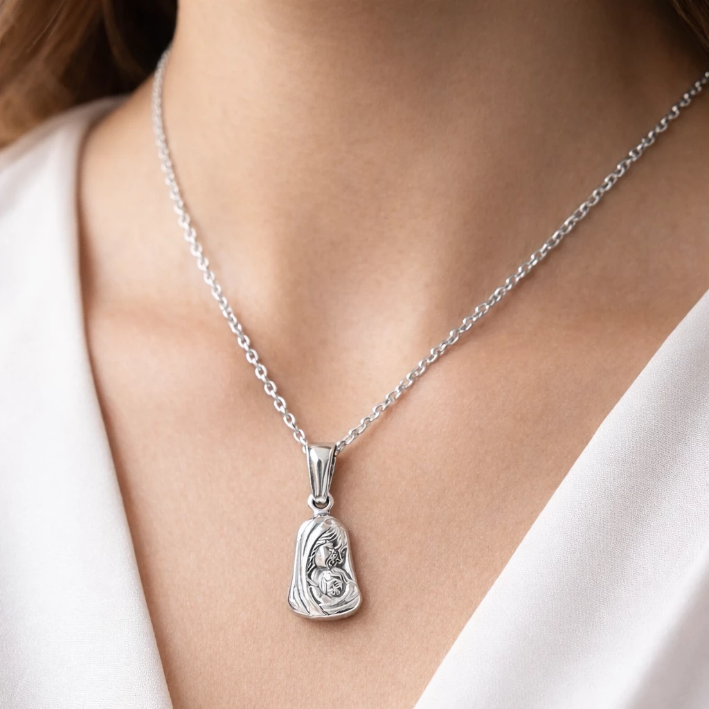 Stříbrný přívěsek Madona mateřství zachycuje něžný a hluboce emotivní motiv Madony s dítětem v náruči. Tento šperk symbolizuje lásku, ochranu a jedinečné pouto mezi matkou a dítětem.
