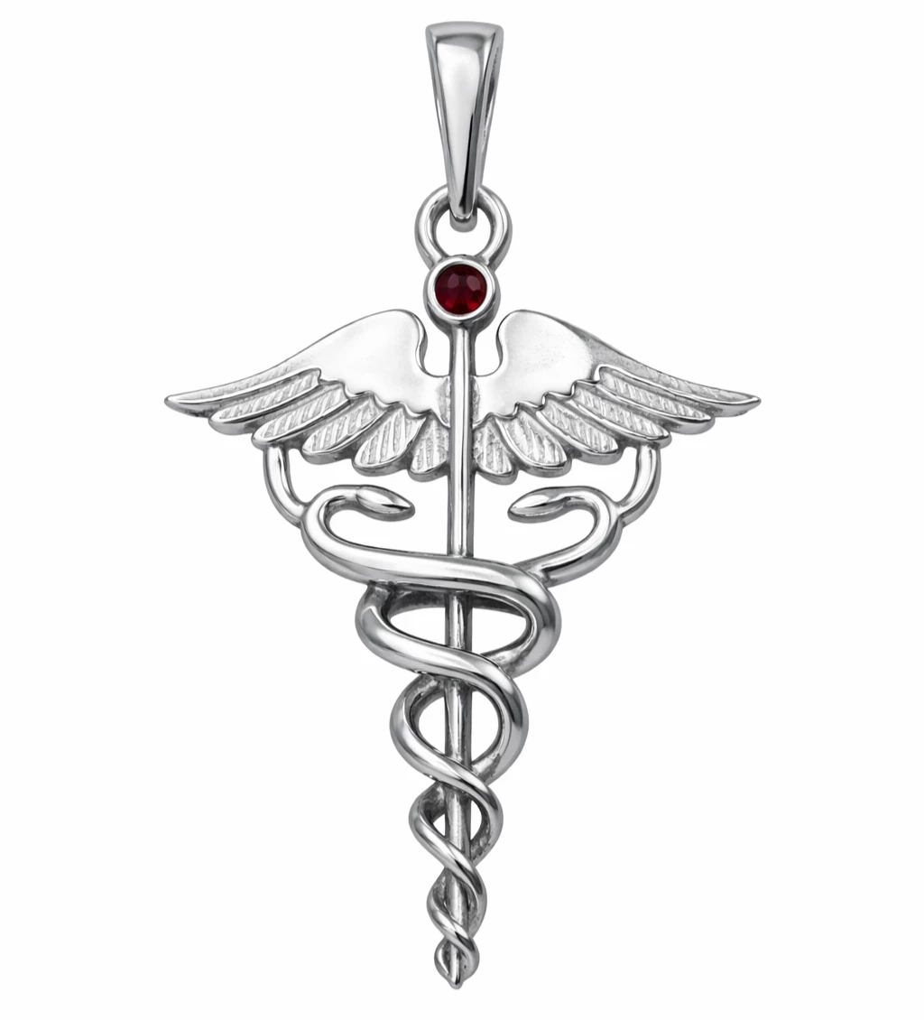 Stříbrný přívěsek Symboly medicíny Lékařská hůl s českým granátem je vyroben z kvalitního Stříbra Ag 925/1000 a zaujme výrazným symbolem spojeným s lékařstvím, ochranou a vnitřní silou. Precizně zpracovaný motiv okřídlené lékařské hole působí elegantně a nadčasově, zatímco drobný český granát dodává šperku sytě červený akcent a jemný třpyt.