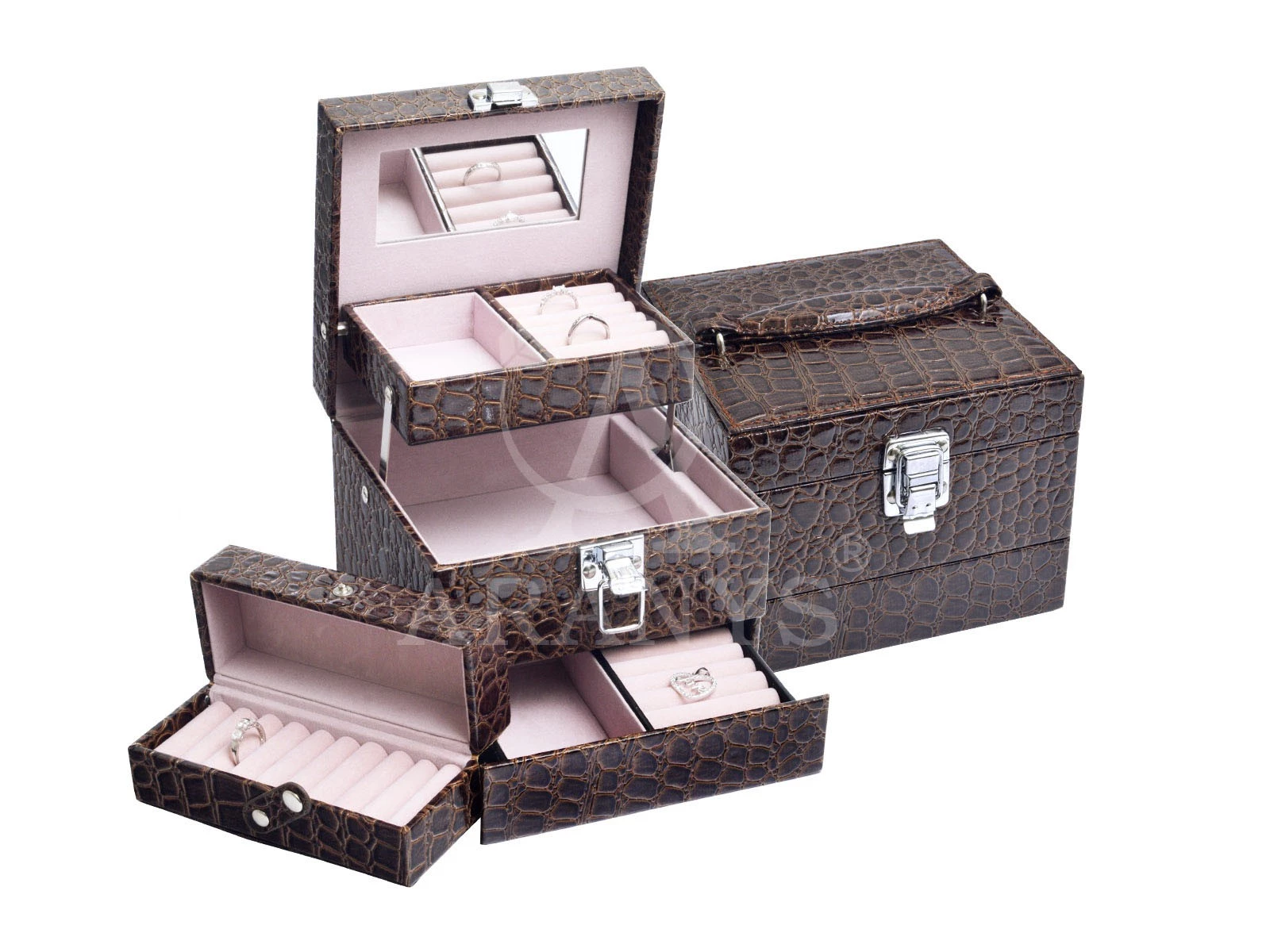 Spodní, samostatně otevíratelný šuplík Vám nabízí možnost uschování prstýnků a náušnic, také se zde nachází volná přihrádka na větší šperky. Po rozepnutí přezky odklopíte horní víko kufříku a tím otevřete první a druhou přihrádku šperkovnice. Na vnitřní straně víka je umístěno zrcátko. Vysunuté první patro je rozděleno na dvě části, jedna slouží k umístění náušnic a prstýnků, druhá část je volná, pro uložení dalších šperků. Prostřední patro této šperkovnice ukrývá vyjímatelnou krabičku na šperky. Po jejím vyjmutí můžete toto patro využít na jakékoliv větší šperky, protože Vám zůstane celé volné. Krabičku, kterou jste ze šperkovnice vyndali je možné zapnout patentkou, aby se Vám při cestování neotevřela.