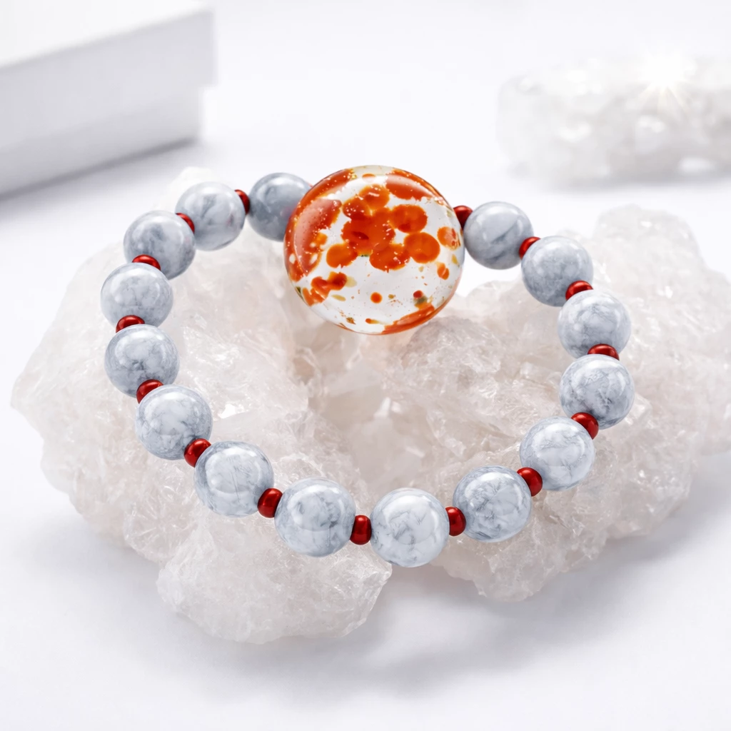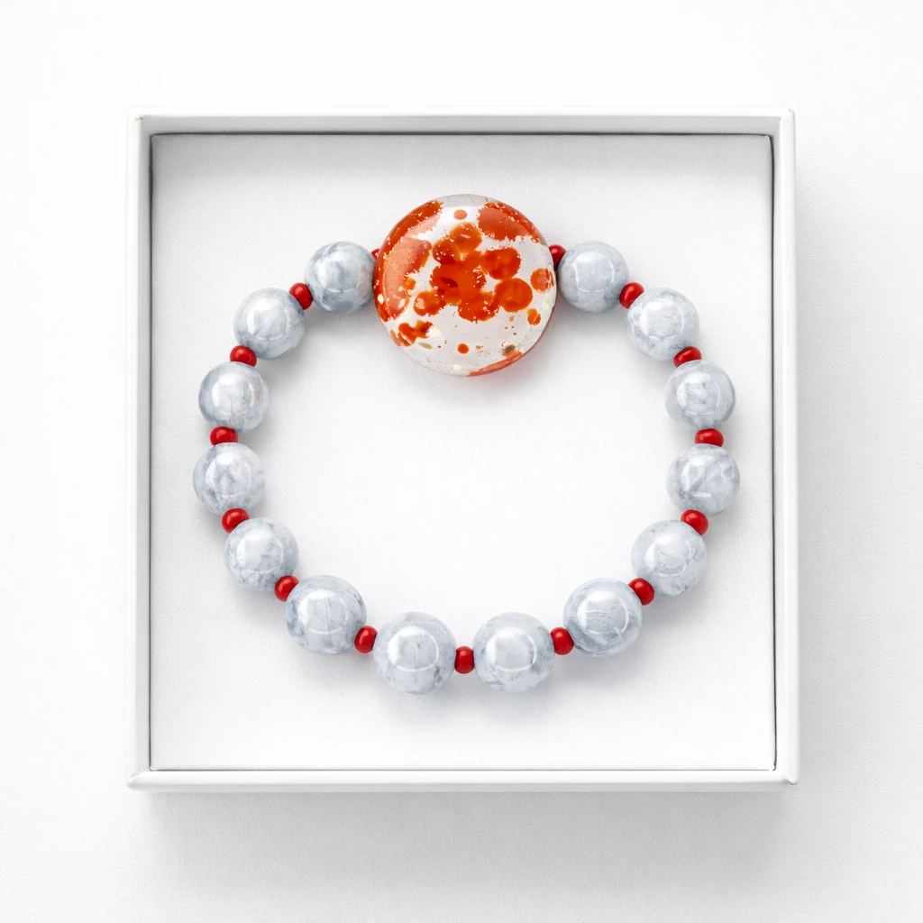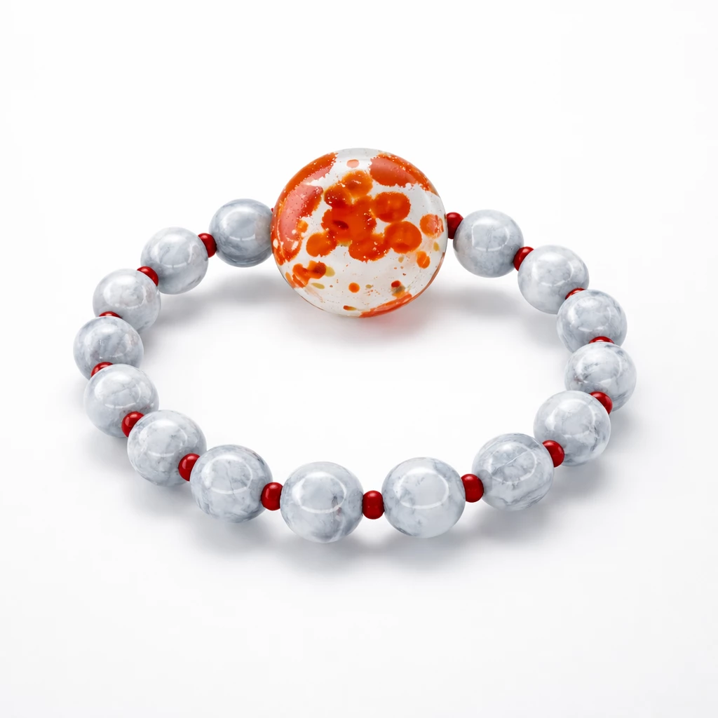 Bižuternímu náramku dominuje masivní korálek v bílo - oranžové barvě uprostřed. Korálky jsou navlečené na pružné šperkařské gumičce, takže náramek uzpůsobíte velikosti zápěstí.