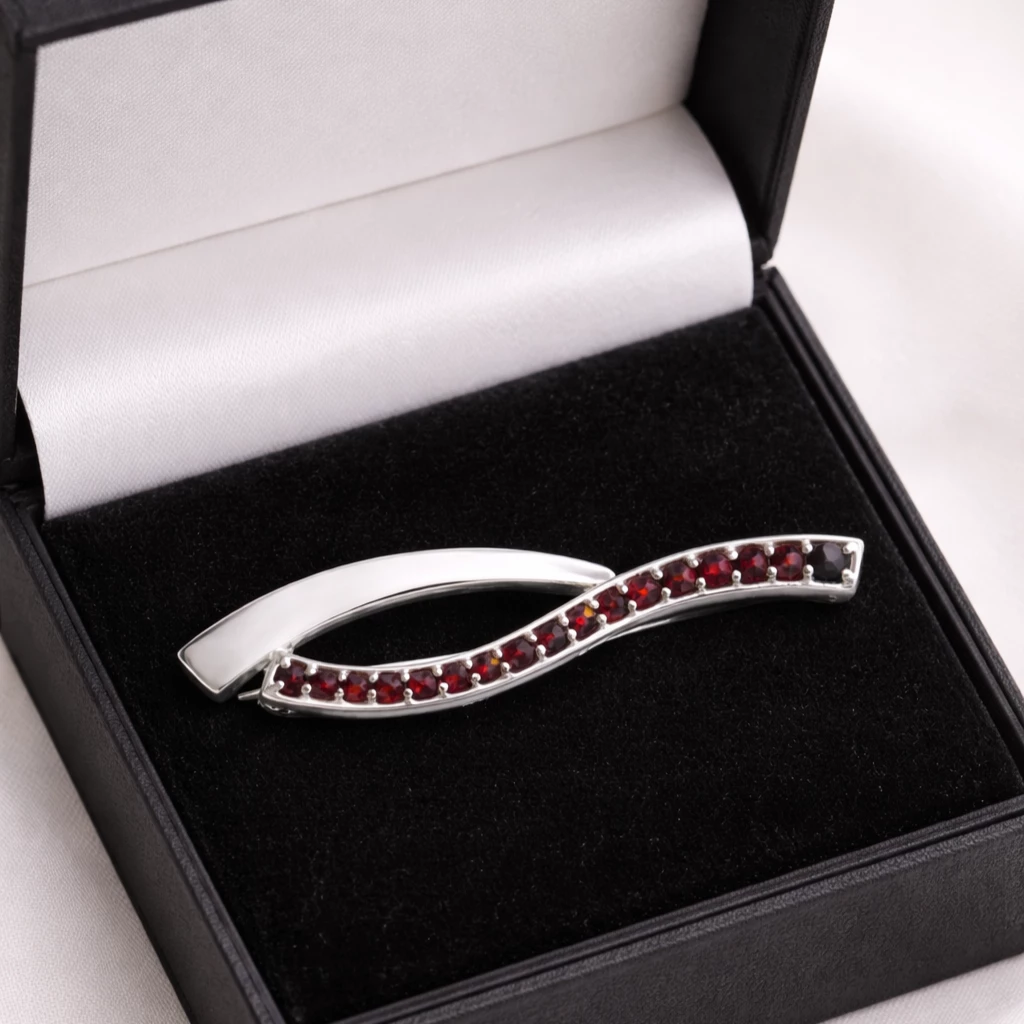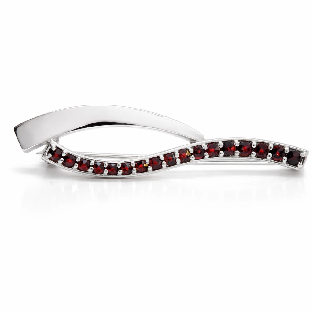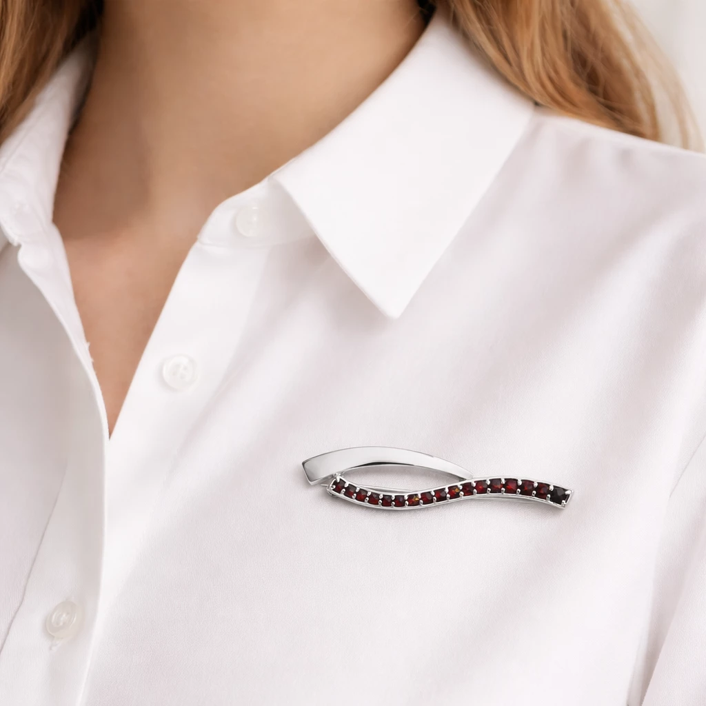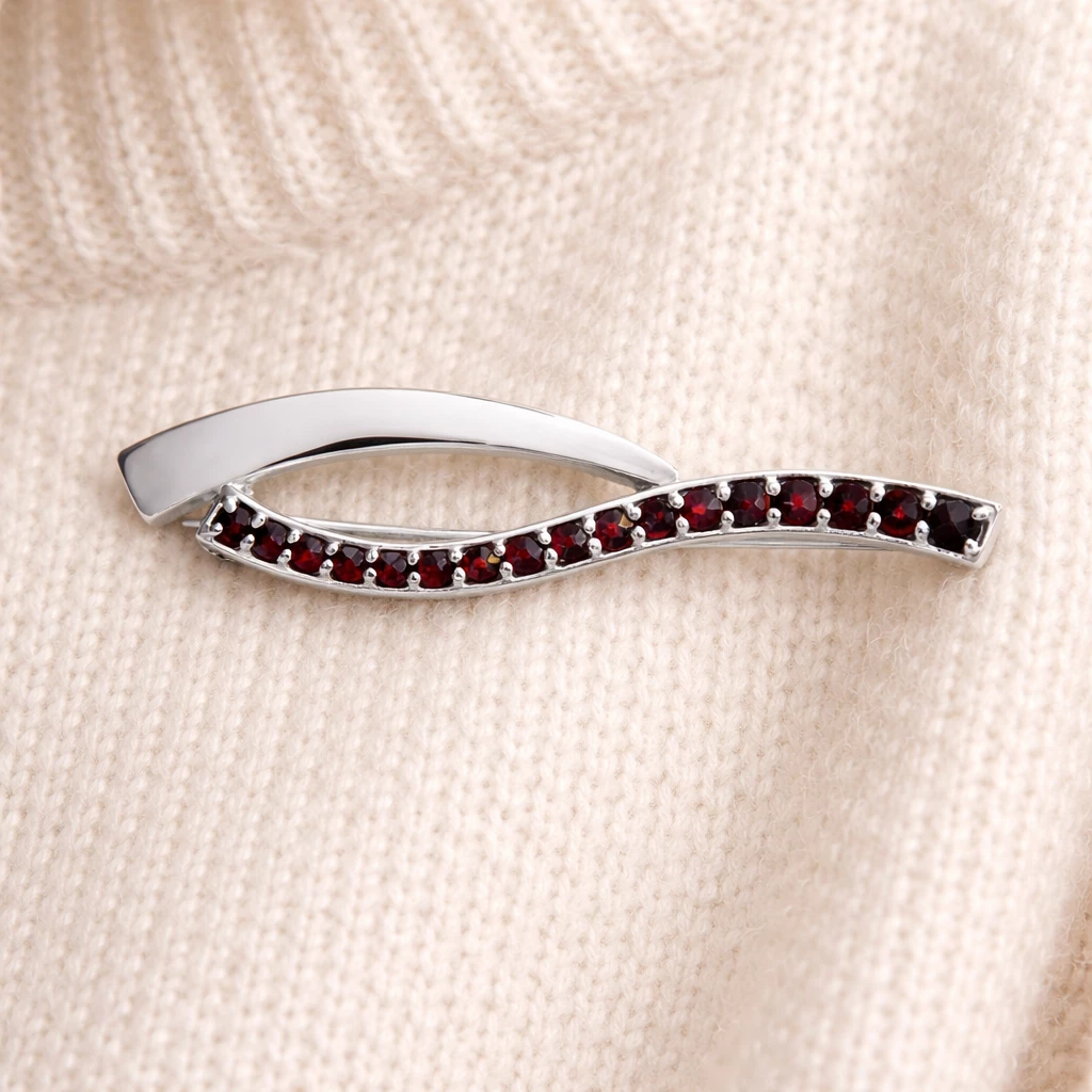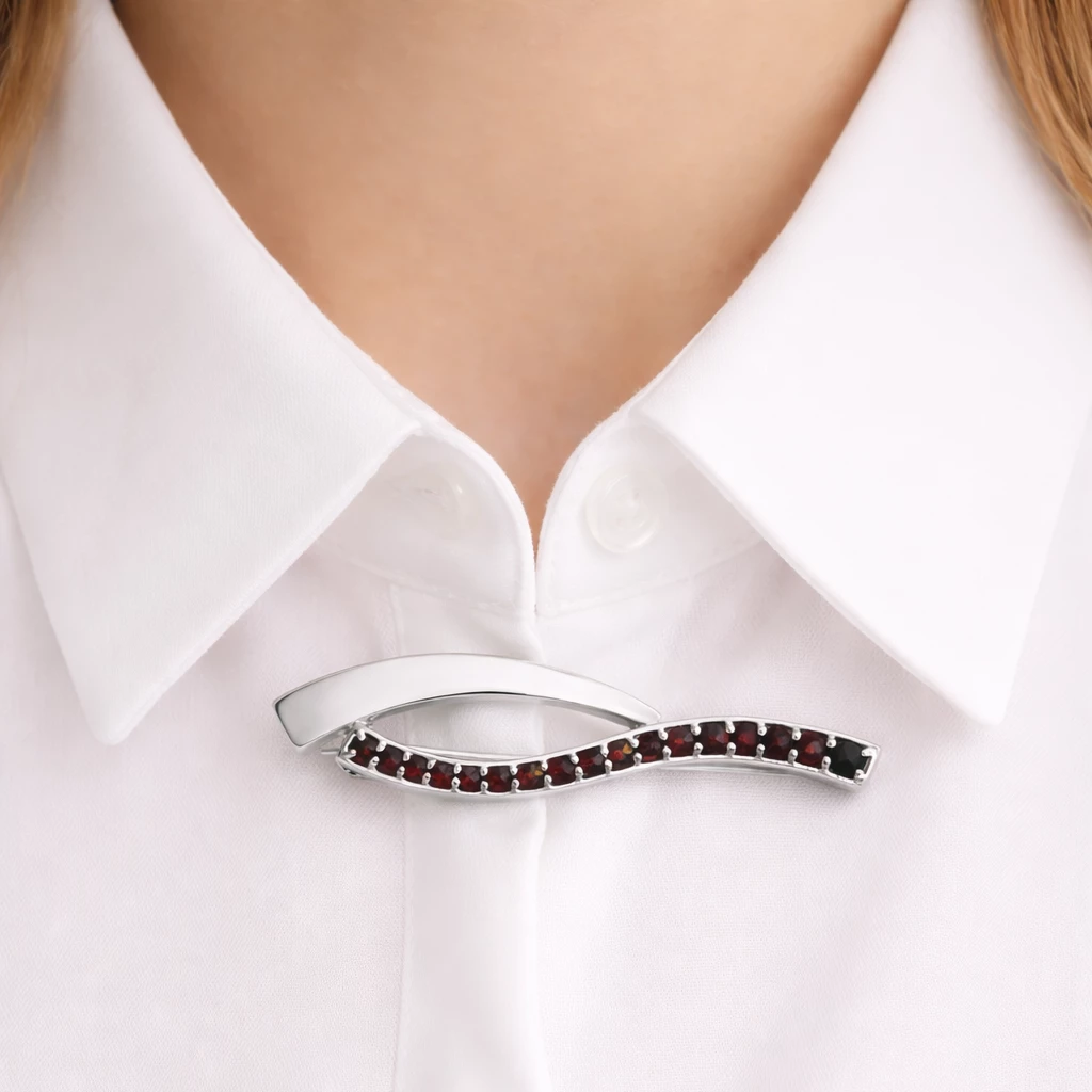 Stříbrná brož Vlna s českým granátem je decentní, ale výrazný šperk, který dodá vašemu outfitu noblesní třpyt a eleganci.