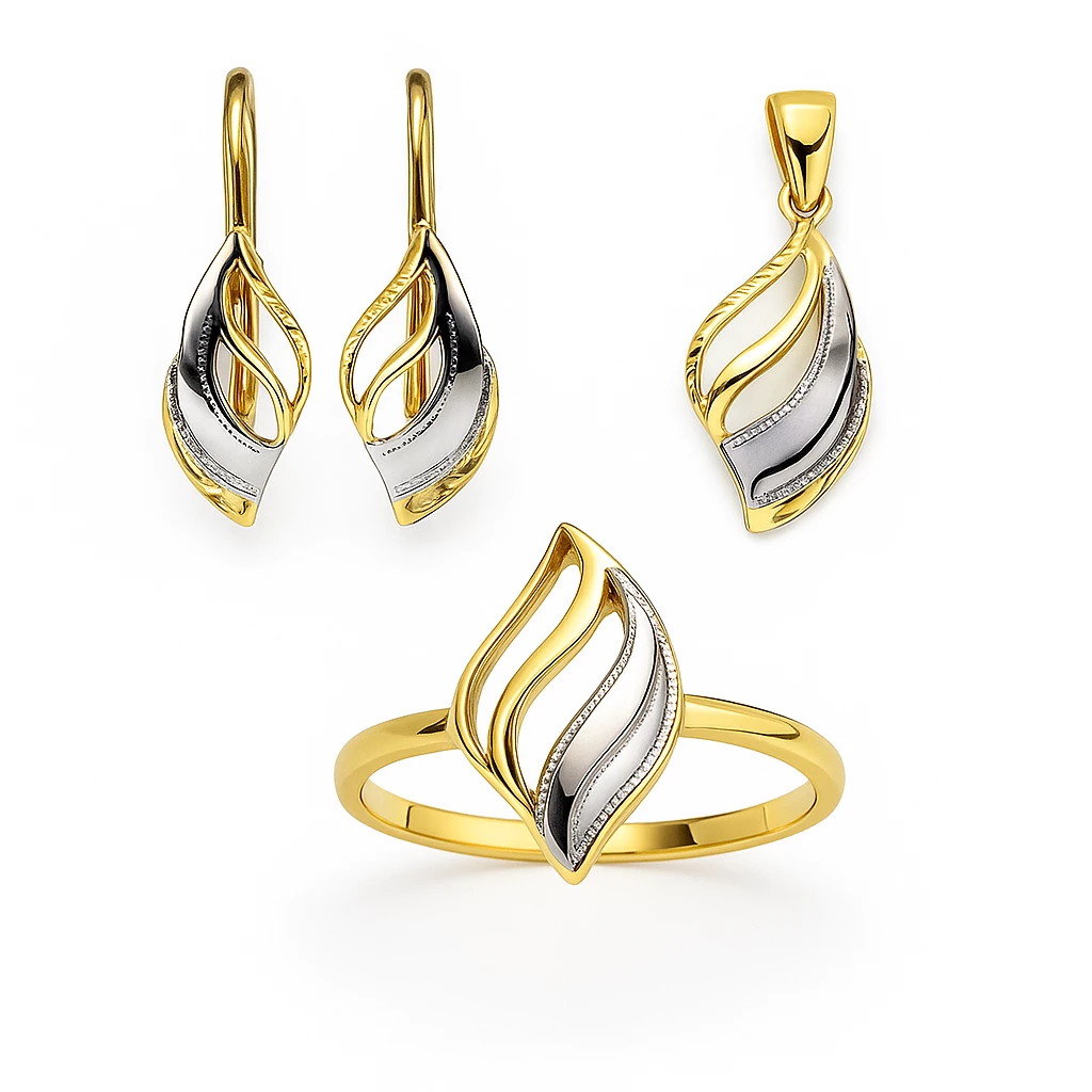 Stříbrná dámská souprava náušnic a přívěsku ve zlacené úpravě s motivem vlnky. Je vhodná jak na slavnostní příležitosti, tak k doplnění běžného outfitu. Náušnice mají zapínání na klapku a k přívěsku doporučujeme dokoupit si také zlacený řetízek. Šperkové sety jsou velmi populární, doporučujeme prozkoumat naši celou nabídku níže.