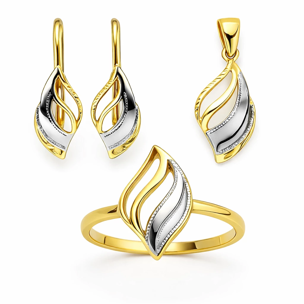 Stříbrná souprava Bicolor je vyrobena z kvalitního Stříbra Ag 925/1000 a zdobena zlacenými detaily, které vytvářejí elegantní kontrast se stříbrným povrchem. Design je založen na plynulých liniích a plastickém 3D zpracování, které šperkům dodává hloubku a sofistikovaný vzhled. Tato souprava obsahuje náušnice a přívěsek. V naší nabídce naleznete i prsten ve stejném designu a nezapomeťe si přikoupit i řetízek.