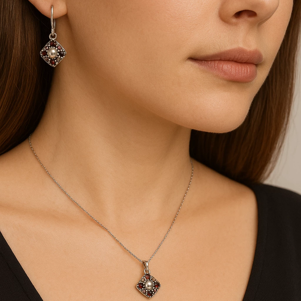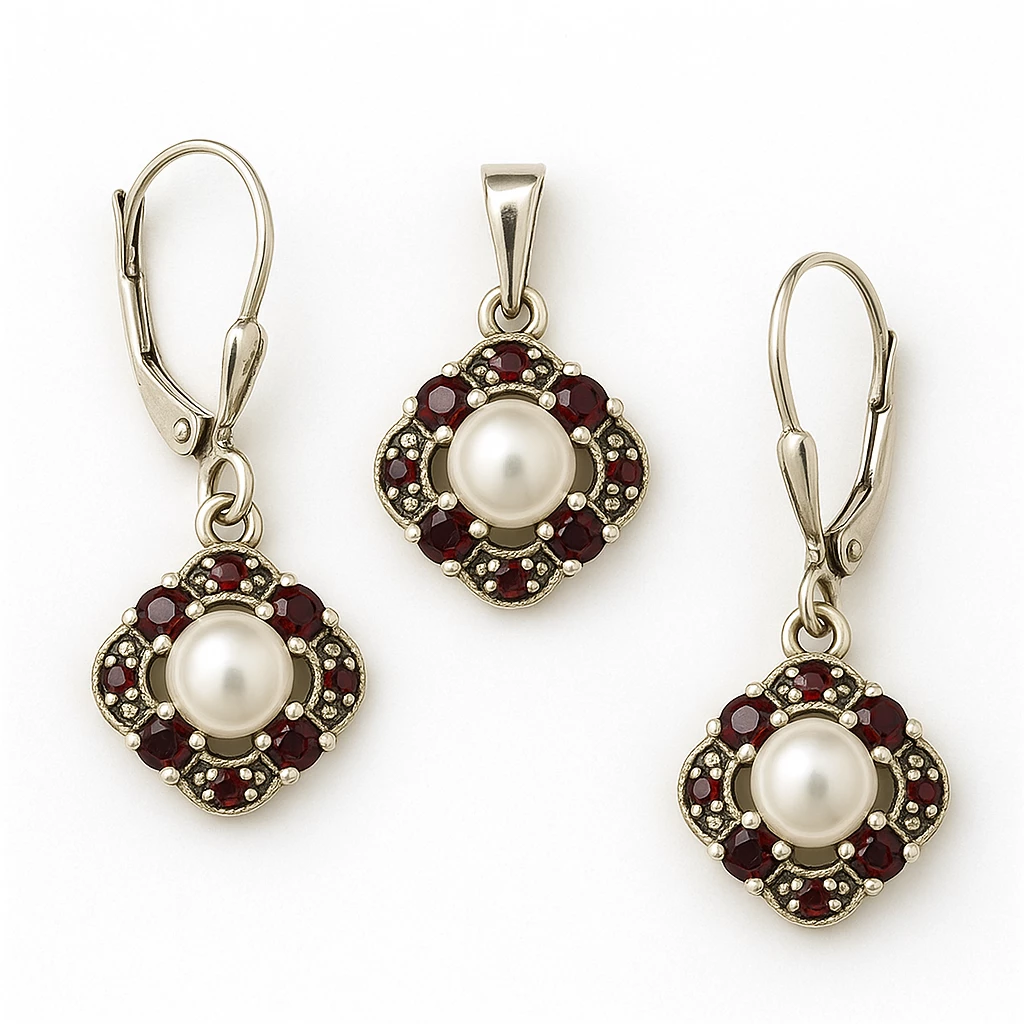 Dokonale sladěná souprava náušnic a přívěsku, kterou zdobí bílé či růžové perly a české granáty. Tento komplet dodáváme i ve zlaceném provedení.