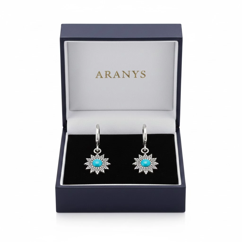 Stříbrné náušnice s modrým tyrkysem Azura jsou vyrobené ze Stříbra Ag 925/1000 a jejich sluneční motiv v kombinaci s patinováním zvýrazňuje každý detail šperku.