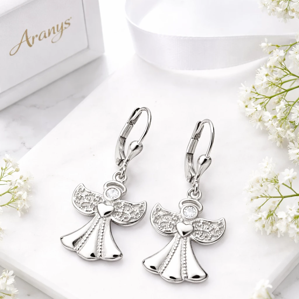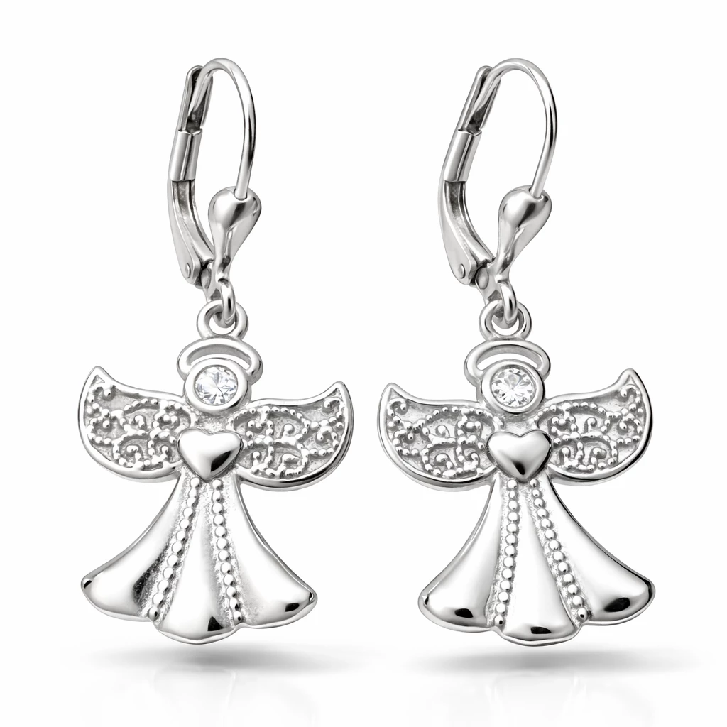 Stříbrné dámské visací náušnice, které zdobí krásně propracovaný anděl, držící srdíčko.