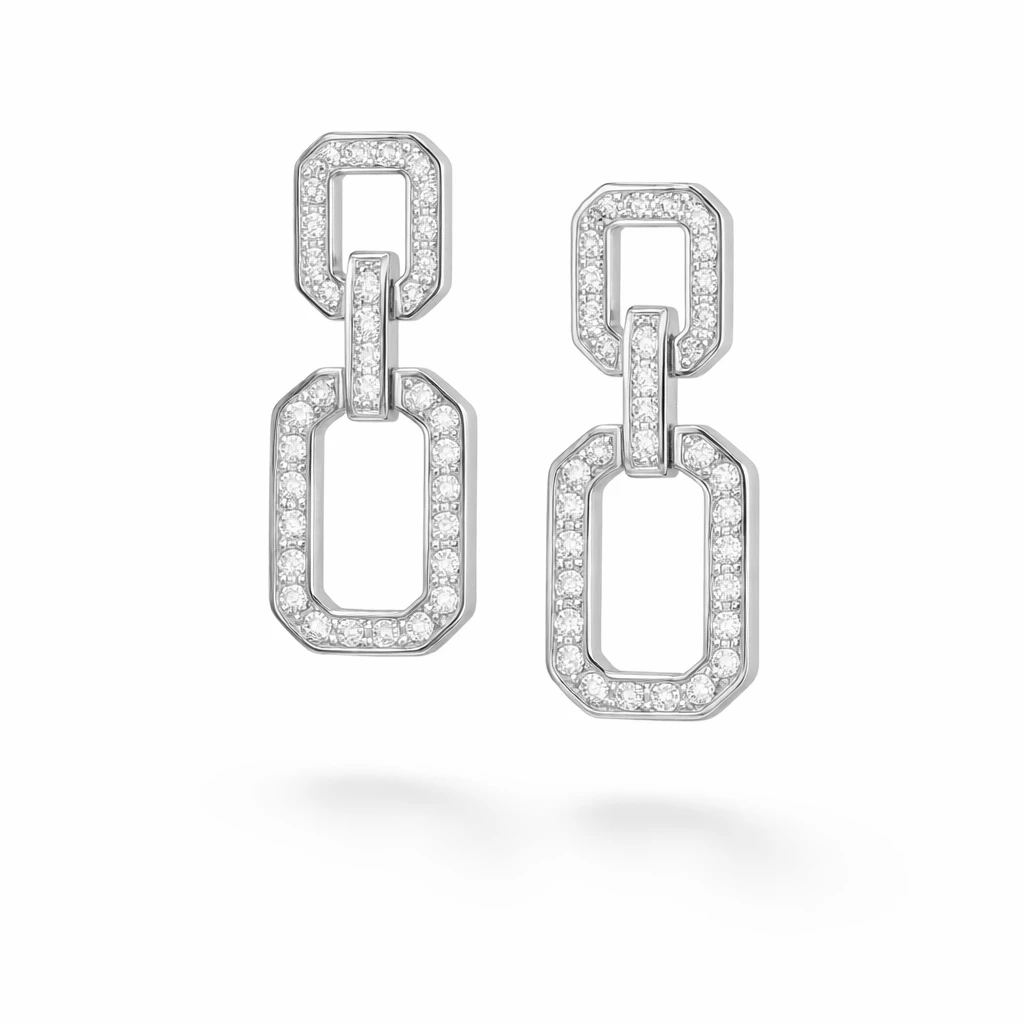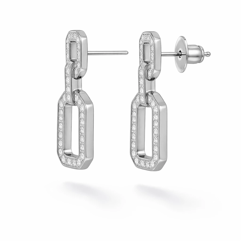 Výrazné třpytivé náušnice vytvořené složením menšího a většího obdélníku osázeného zirkony upoutají na první pohled.