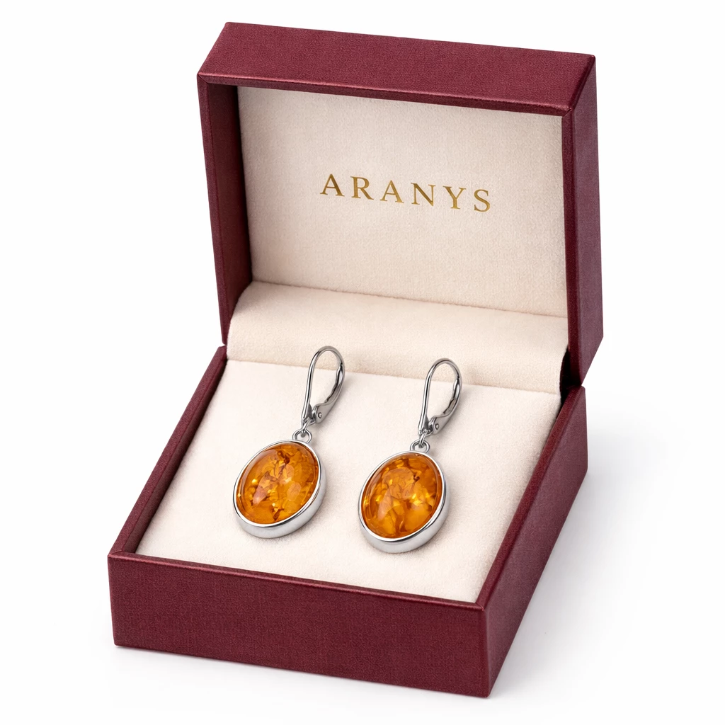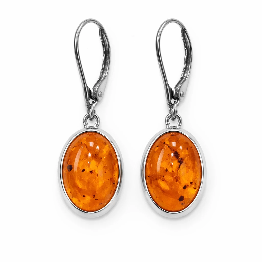 Stříbrné náušnice s jantarem Melia vynikají oválnými kameny v hřejivém tónu a čistým zasazením do Stříbra Ag 925/1000. Díky praktickému zapínání se pohodlně nosí a krásně rámují obličej.