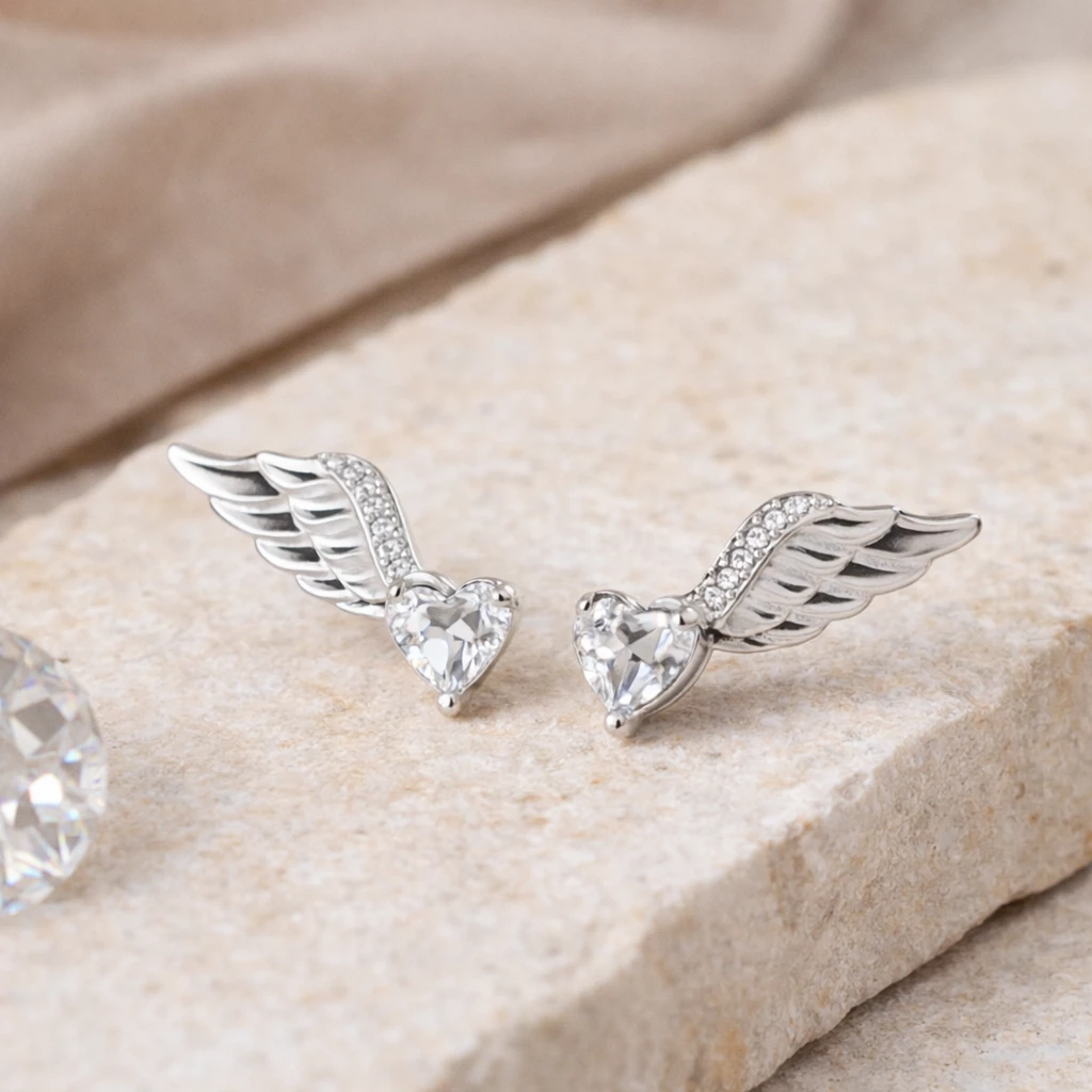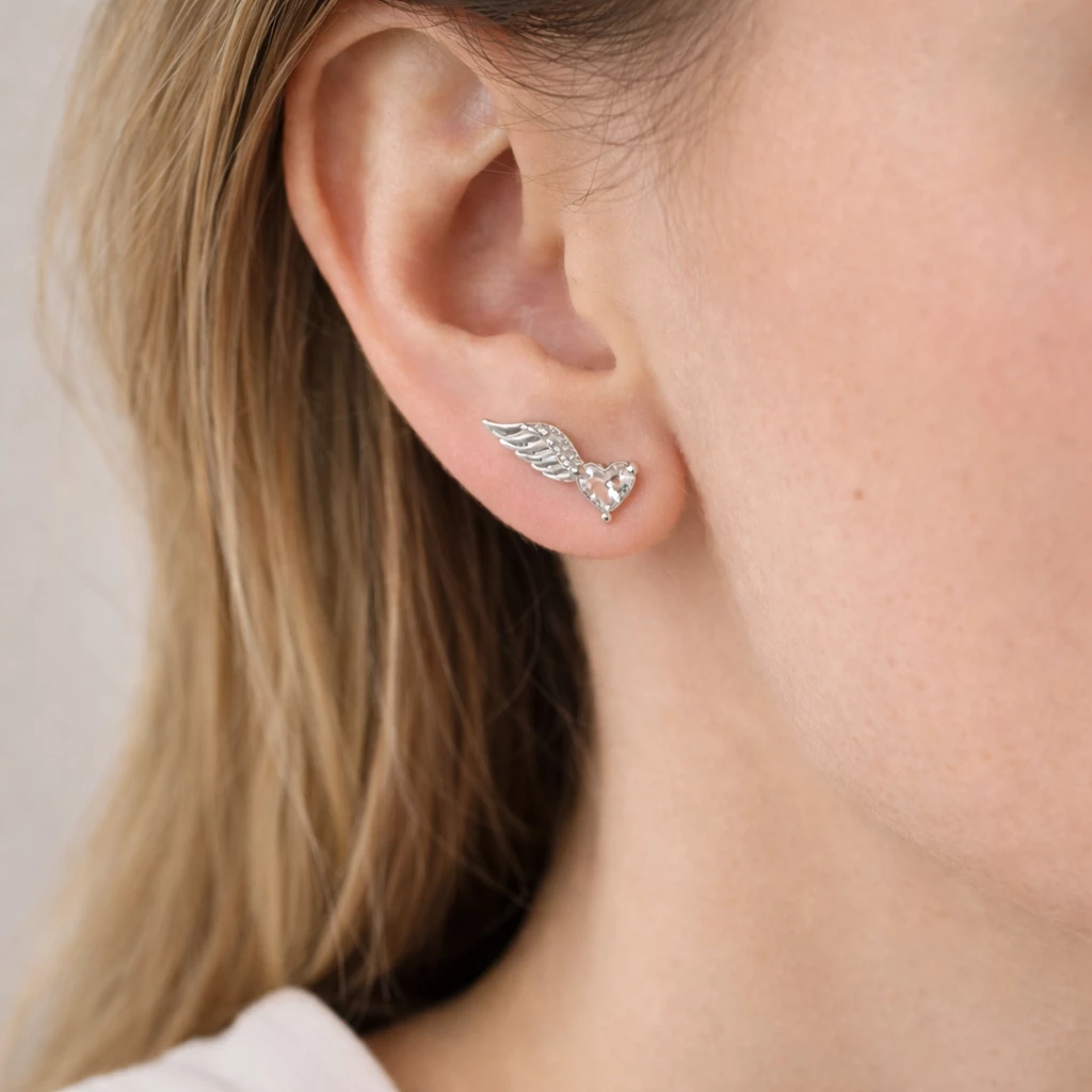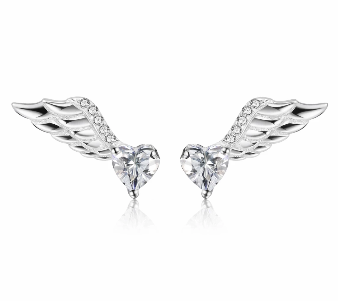 Jemné náušnice ze Stříbra Ag 925/1000 ve tvaru křídel zdobené třpytivými zirkony, které dodávají šperku elegantní lesk a symbolický význam.