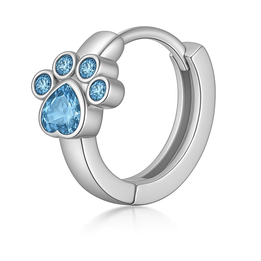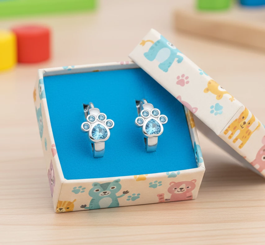 Každá náušnice je ozdobena třpytivým modrým kamínkem ve tvaru kapky a drobnými kulatými zirkony, které vytváří kouzelnou tlapku. Díky pohodlnému zapínání se skvěle hodí na celodenní nošení – do školky, školy i na rodinné oslavy.
