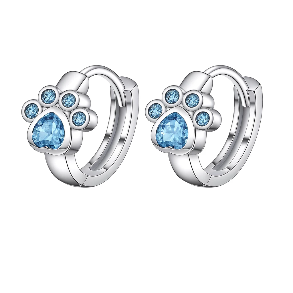 Roztomilé stříbrné dětské náušnice ve tvaru tlapky s třpytivými modrými zirkony. Ideální první šperk pro malé parádnice, dodávaný v hravé dárkové krabičce se zvířátky.